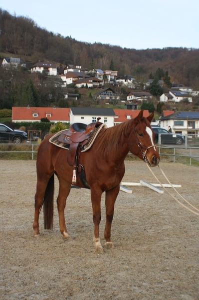 Kruzi „Kruzinintothenite“ ist eine wunderschöne 4-jährige Quarter Horse Stute mit AQHA-Papieren und einem Stockmaß von ca. 1,62 m von KEEP ON KRUZIN x ITS MY NITE. Sie überzeugt nicht nur durch ihre starke Pleasure- und Allround-Abstammung, sondern ganz besonders durch ihren lieben, ehrlichen und unerschrockenen Charakter. Kruzi ist angeritten in Schritt und Trab, dabei stets motiviert, aufmerksam und bemüht, ihrem Reiter zu gefallen. Zusätzlich habe ich mit ihr schon an Bodenarbeitskursen teilgenommen, die sie sehr brav, konzentriert und vorbildlich gemeistert hat. Auch hier zeigte sie sich lernwillig, nervenstark und kooperativ. Sie geht problemlos alleine ins Gelände, ist brav beim Hufschmied, verladefromm und zeigt sich auch in neuer Umgebung stets gelassen und zuverlässig. Kruzi hat vollständig AQHA Papiere,einen Equidenpass und eine aktuelle AKU. Sie kennt Straßenverkehr, Landmaschinen, Hunde, Katzen, Schafe und Kühe. Auch von Kindern lässt sie sich problemlos handeln. Kruzi stand bereits in Boxenhaltung als auch Offenstallhaltung und ist dabei eher rangniedrig, wodurch sie sich gut in bestehende Herden integriert. Aufgrund von Zeitmangel durch Änderungen in meinem Privatleben werde ich Kruzi leider nicht mehr gerecht und kann nicht weiter ausbilden. Aus diesem Grund habe ich mich schweren Herzens zu diesem Schritt entschieden. Durch ihre sehr gute Abstammung und ihre tollen, flachen Gänge eignet sie sich optimal als Nachwuchspferd für den Sport, insbesondere für Pleasure, Allround und Trail, ebenso als zuverlässiger Freizeitpartner. Auch für die Zucht ist sie aufgrund ihres wirklich guten Papiers sehr interessant- Im täglichen Umgang ist sie menschenbezogen, nervenstark und macht einfach jeden Tag Freude. Ich gebe sie nur in gute, verantwortungsbewusste Hände ab, die ihr weiteres Potenzial zu schätzen wissen. Videos an der Longe und unterm Reiter sind vorhanden.