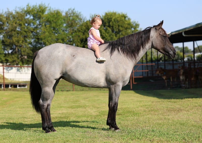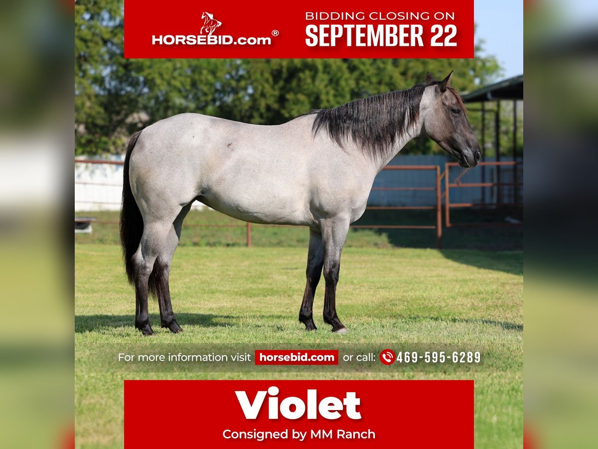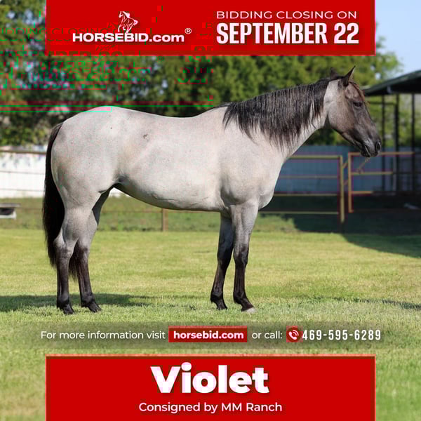 🍁𝒕𝒉𝒆 𝐅𝐀𝐋𝐋 𝑺𝒑𝒆𝒄𝒕𝒂𝒄𝒖𝒍𝒂𝒓🍁 Happening now thru MONDAY | SEPTEMBER 22nd - Available EXCLUSIVELY on HorseBid's website! For more details and to register visit: www.Horsebid.com CONSIGNOR CONTACT: MM Ranch 469-595-6289 LOCATION: Forney, TX BREED: Quarter horse REGISTERED: No COLOR: Blue Roan Grulla HEIGHT: 14.2 AGE: 4 GENDER: Mare 🌈Unicorn Alert!!!🌈 This is Violet The most unique and rare colored little mare. She is a blue roan grulla. She almost has a purple like appearance. Absolutely a GLAMOROUS mare. A once in a lifetime find and at just 4 yrs old she has her whole life in front of her. She was born and raised on the same place. Imprinted and handled since birth. She has the most loving and kind disposition. She is naturally gentle and kind. Doesn’t have a mean bone in her body. Absolutely loves attention from any and everyone. Especially kids. Not even an ounce of spookiness. No snorting or watchiness. Absolutely no bad habits. She is the ultimate sweetheart. Violet has a solid foundation in her training. 🌟Rode as a 2 yr old, then as a 3 yr old she has 90 days of professional reining and work cow horse training. She has all the ability and cow sense. So talented and smart. ✨This girl could stand in place in lope. She is so refined and elegant. Her trot and lope is like warm butter spreading across fresh bread. Effortless!!So smooth and easy. You barely have to squeeze to get her to step off in it. She is Fancy!!! She is ready to go on and do big things. She has been rode both in and out of the arena. Rode out on the ranch and checked cattle and been on lots of trail rides. You do not have to be a cowboy to rode her. 💥The best thing about her is she is gentle. She perfect to be mounted. Stands perfect for baths. She will meet you at the gate every time. Every time. And comes right up to you and puts her head in the halter. She loves going to work. She wants to please and wants to learn. Absolutely NO warming her up. Just jump on her and go. I would absolutely say she is safe for anyone to ride. She really has the capability to do anything you want to do on her. You will get noticed riding her. Violet will stand out from the crowd. 🌎 We can and will help arrange affordable shipping if needed.