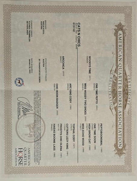 Super lieve en mooie Quarter Horse merrie uit 2021, vader Woodys Time (Cutting) en moeder Arcchica (reining/cutting lijnen). Ze is gestart in de cutting, maar ook zeer geschikt voor kinderen/gezin of andere disciplines. Ze is leergierig, werkt graag, braaf, kent buitenritten, en is gezond. Paneltest negatief via haar ouders, dus ook geschikt voor de fokkerij vanwege haar uitstekende lijnen. Ze wordt door haar eigen prestaties verder opgeleid als jong paard.