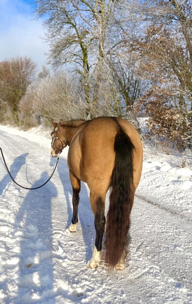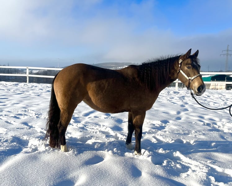 ⚜️ Gunna Spark Again ⚜️ 2021 QH Buckskin Stute 148 cm Panel Test n/ n und iMM ebenfalls n/n Bildschöne im QH Typ stehende Stute vom legendären Million Dollar Sire Gunner Dun It Again Aus einer direkten Steadys Dude Stute x Shining Spark. „Sparky“ ist im Umgang total unkompliziert - Sie ist leicht nachzureiten und auch für Anfänger / Jugendliche geeignet. Nach ihrer Grundausbildung kam sie zu den jetzigen Besitzern, die sie als reines Freizeitpferd genutzt haben. Sie hatten den Traum sie als Zuchtstute einzusetzen. Leider muss Sparky wegen schwerer Krankheit der Besitzer abgegeben werden. Ein gutes zu Hause steht für sie an erster Stelle. Sparky steht aktuell bei uns um sie Trainingstechnisch aufzufrischen und sie i.A . Zu verkaufen. Sie wünschen sich für Sparky ein zu Hause als Familienpferd für Freizeit /ambitionierten Freizeitreiter oder wegen ihrem Exzellenten Papier als Zuchtstute . Sie hat keine Reining Ausbildung ( Basics lernt sie gerade kennen ) Im Gelände ist sie noch unerfahren. Insgesamt ist sie Charakterlich Ein ruhiges Pferd, dass nicht jeden Tag laufen muss , sie fährt sich nicht hoch - sie hat absolut keine Unarten wie wegrennen / steigen / bocken und verzeiht Fehler des Reiters. Wenn sie sich erschreckt dann auf der Stelle. Wer ein Traumpferd mit Potential sucht zum weiter Ausbilden oder sie als Zuchtstute einsetzen will ist bei Sparky genau richtig. VIDEO : https://youtube.com/shorts/k7IXJ3j-8gY?si=hSeW5aqUMbeg0OuV Preis : 15.500€ vhb. Für ein Probereiten nehmen wir uns gerne Zeit und berechnen 40€ .