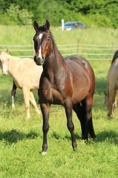 Expressive athletic cowhorse mare for sale from very high-quality performance lines. Kitty Boon SR is a very athletic young mare with cat-like quick movements and a very watchful eye. Unused and robustly grown, she is ideal for starting her under saddle now. She is familiar with groundwork, lunging, rider weight, and is very obedient and eager to learn. She is barefoot, lives in a large mixed-age and mixed-gender herd in a loose housing system, and holds a high rank within the group. Kitty is confident and fair to other herd members. She is only for sale to individuals with extensive experience with sensitive, intelligent cowhorses. As a yearling, she had an impression fracture of the forehead, which was not operated on and healed on its own without affecting her. There is only a dent visible on her face. Otherwise, she has never been sick. She carries GBED and MYHM - LWO and is 4 Panel N/N.