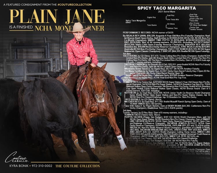 ▪️▫️◾️𝐭𝐡𝐞 𝑴𝒂𝒚 𝐒𝐞𝐥𝐞𝐜𝐭◾️▫️▪️ Happening now thru MONDAY | MAY 4th - Available EXCLUSIVELY on HorseBid's website! For more details and to register visit: www.Horsebid.com CONSIGNOR CONTACT: Couture Caballo 972-310-0002 LOCATION: Fort Worth, TX BREED: AQHA REGISTERED: Yes REGISTERED NAME: Spicy Taco Margarita COLOR: Sorrel HEIGHT: 14.2 AGE: 5 GENDER: Mare There’s an old saying my grandparents would always tell me, and it rings clear as can be with this mare: “Purdy is as Purdy does.” On the exterior, you’re looking at a plain Jane. One you might scroll past. One easily overlooked at first glance. But after spending but a moment with this gal, Jane proves exactly why you don’t need to be shiny or chrome to be beautiful. That a true beauty stems from whats under the hood. Jane might not scream for attention, but this little sorrel mare earns your admiration through who she is on a daily basis. Spicy Taco Margarita, affectionately known as “Plain Jane,” has been in a professional cutting program her entire life and shows up exactly how you’d hope every single day—seasoned, experienced, consistent, and ready to go to work. By the million dollar sire, Sigala Rey (6 Panel N/N) and out of a half sibling to the NCHA earner of over $220k, Taco Buena (LTE $17K+ | Producer $28K+), making her as valuable on paper as she is in the saddle. A finished cutter with a true user friendly feel, Jane rides around on a draped rein, neck reins with ease, and carries herself with that smooth, confident cadence that makes her a pleasure both in and out of the arena. She’s athletic, very cowy, quick footed with a huge stop to match. This mare is built to perform and is as broke as a 50 cent taco. Whether you’re hitting the weekend cuttings, chasing a versatility title, or poking around out on the ranch, Jane brings the perfect balance of spice and amicability to daily life! She cuts, sorts, works a gate, has a short jog, a long, ground-covering extended trot, and a steady, dependable mindset. Underneath it all, she’s solid and clean made with a foundation you can trust. No shortcuts, no holes, just a well rounded gal that’s ready to add so much to her next riders life! Eligible for: Breeders Invitational, NCHA Super Stakes, NRCHA Stallion Stakes, Southern Cutting Futurity Stallion Incentive, Legendary Stakes
