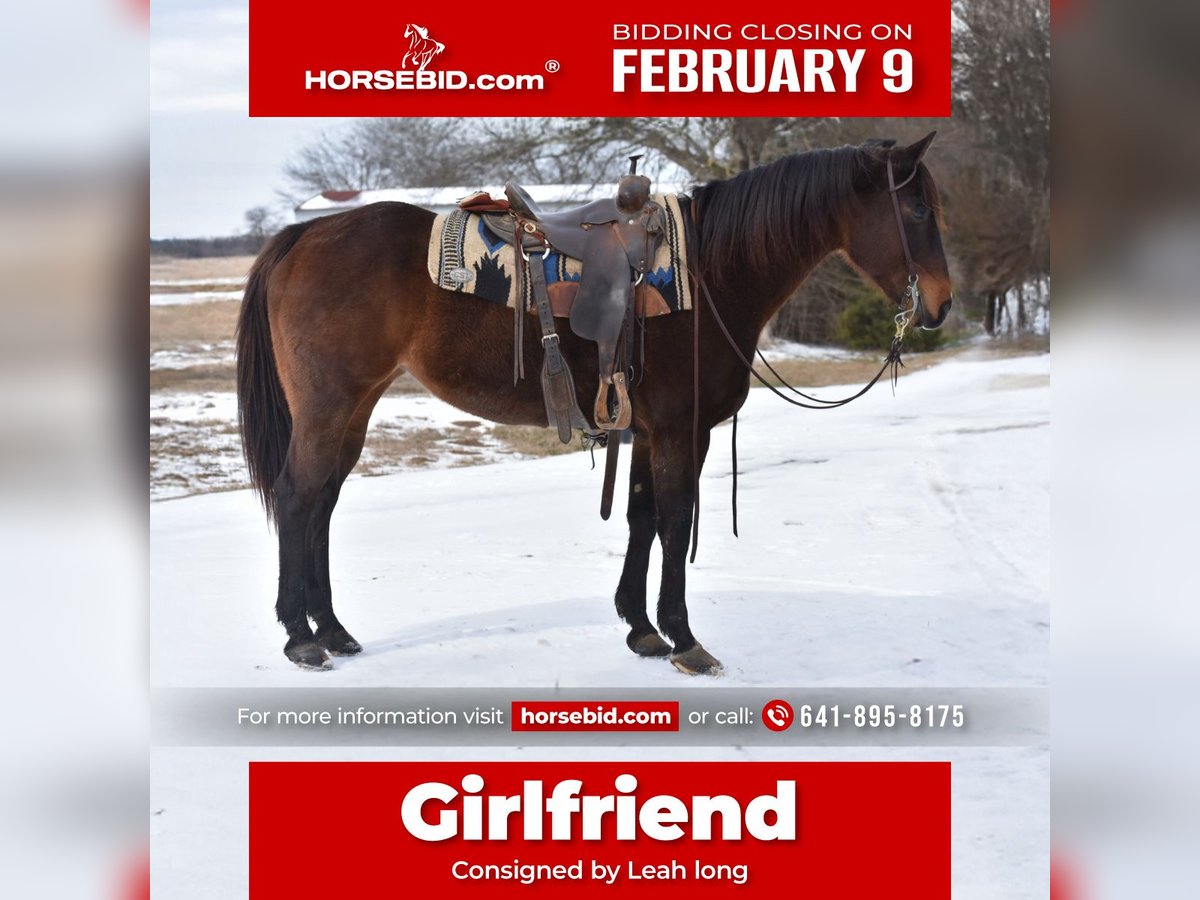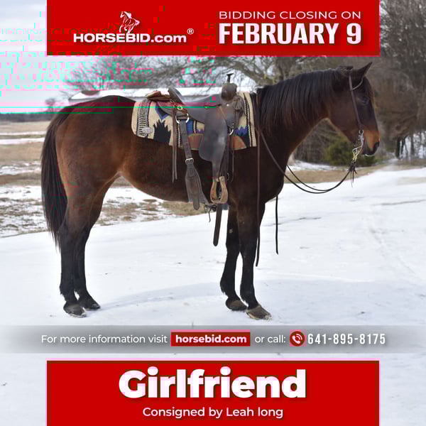 ❤️🔥𝑩𝒆 𝑴𝒊𝒏𝒆 𝐒𝐄𝐋𝐄𝐂𝐓❤️🔥 Happening now thru MONDAY | FEBRUARY 9th - Available EXCLUSIVELY on HorseBid's website! For more details and to register visit: www.Horsebid.com CONSIGNOR CONTACT: Leah long 641-895-8175 LOCATION: Sulphur Springs, Texas BREED: QH REGISTERED: Yes REGISTERED NAME: girlfriend COLOR: Bay HEIGHT: 15 AGE: 6 GENDER: Mare Girlfriend is a 6-year-old grade mare standing a solid 15 hands tall, and she is the kind of horse that’s hard to find and even harder to replace. She is exceptionally sweet, very easy to catch, and a joy to have around whether you’re riding or just spending time with her. She has a kind eye, a quiet mind, and a gentle nature that makes her a pleasure for riders of many levels. Under saddle, Girlfriend is easy, soft, and uncomplicated. She is really gentle and easygoing, with no nonsense or fuss—the type you can saddle up and enjoy every ride. She is safe and steady, always willing to do her job and take care of her rider. She doesn’t get rushed, nervous, or worked up, and she’s happy to go at whatever pace you ask. Girlfriend truly shines on the trail. She will cross absolutely anything you point her at, including water, ditches, logs, tarps, and other obstacles, without hesitation. She rides confidently through town, handles traffic well, and has carried the flag calmly and correctly. New environments and unfamiliar situations do not bother her—she approaches everything with a quiet confidence and a willing attitude. This mare is incredibly versatile and dependable, making her a great fit for someone looking for a safe, honest trail partner or an all-around mare that can do a little bit of everything. If you’re searching for a sweet, trustworthy horse with a great brain and a kind heart, Girlfriend is ready to step into that role and be someone’s once-in-a-lifetime kind of horse. We recommend a rider that knows the basics.