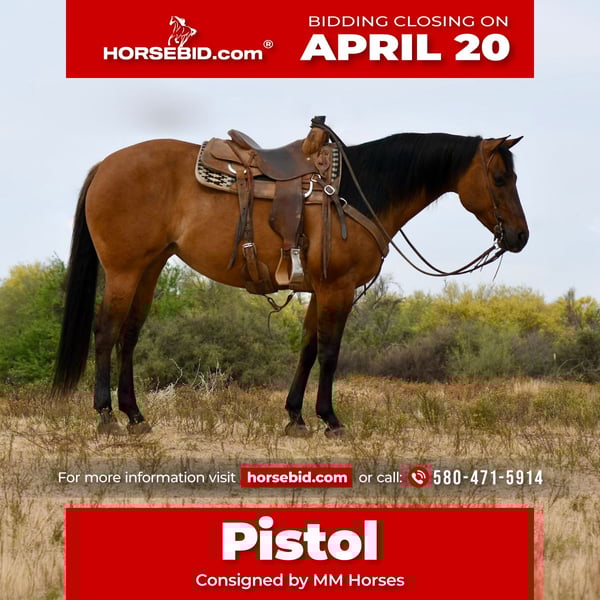 ⚜️𝐭𝐡𝐞 𝓔𝓵𝓲𝓽𝓮 𝐒𝐩𝐫𝐢𝐧𝐠 𝐂𝐥𝐚𝐬𝐬𝐢𝐜⚜️ Happening now thru MONDAY | APRIL 20th - Available EXCLUSIVELY on HorseBid's website! For more details and to register visit: www.Horsebid.com CONSIGNOR CONTACT: MM Horses 580-471-5914 LOCATION: Rio Verde, AZ BREED: Aqha REGISTERED: Yes REGISTERED NAME: Shoot ur shot COLOR: Dun HEIGHT: 15 AGE: 6 GENDER: Mare Pistol is a 15 hand dun mare that is exceptional in so many ways. She was professionally trained in the reigning her 2 and 3 yo years. She then went to a barn where there were a lot of novice and youth riders where she was used to teach and give lessons on. She has been trail ridden through very rough terrain and been in a lot of spooky situations and has never batted an eye. Pistol has been used to rope the smarty for beginner ropers taking lessons and she has been used to push cattle as well. Pistols best attribute is she does every reining maneuver with ease but no matter in the pattern or out on the trail she is simple to ride and any level rider can ride her with confidence. She also definitely has the confirmation, disposition, and breeding to raise a very nice colt. Pistol is good to load, haul, clip,bathe,shoe, etc.etc. Feel free to call or message or come ride her. You won’t be disappointed.