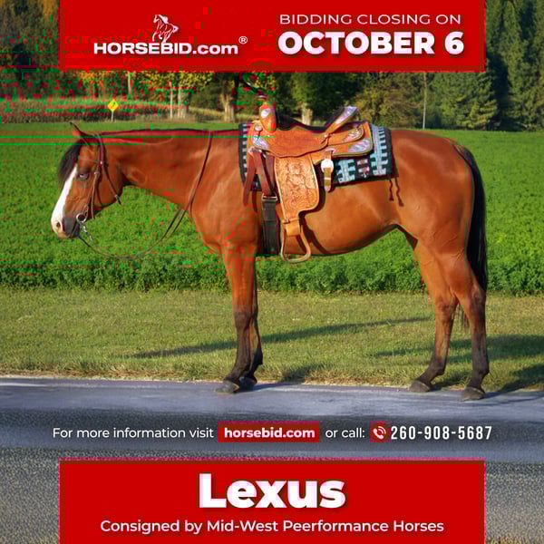 🍂 𝓐𝓾𝓽𝓾𝓶𝓷 𝑨𝑳𝑳 𝑺𝑻𝑨𝑹 𝑳𝑰𝑵𝑬𝑼𝑷 🍂 Happening now thru MONDAY | OCTOBER 6th - Available EXCLUSIVELY on HorseBid's website! For more details and to register visit: www.Horsebid.com CONSIGNOR CONTACT: Mid-West Performance Horses 260-908-5687 LOCATION: Saint Joe, IN BREED: Quarter Horse REGISTERED: No COLOR: Bay/1 blue eye HEIGHT: 15.1 AGE: 5 GENDER: Mare This stunning lady is a 2020 model, Quarter Horse, standing a stout 15.1 hands tall and weighing in at around 1,200 pounds. This mare is absolutely beautiful! Lexus is a flashy mare that has a outstanding disposition and is always willing to please. Dont let her young age fool you, this mare already has alot of training and is ready to go in any direction. Lexus will trail ride out alone or with a large group of people. She will gladly lead the pack, or stay in the back. She goes through water, crosses logs, brush, tall grass, you name it she will go through it. Lexus is 100% TSS and has no vices. Lexus will go up and down any terrain reguardless of the condition. She has been ridden by all ages and skill levels of riders. She has been on lots of trail rides with my 15 year old daughter and her friends and has never failed her! Lexus will ride bareback and double as well. She is ball broke and tarp broke. She will stand tied to a picket line all day and night for over night camping trips. Lexus loves cows and would excel in cow sorting. Lexus has been turnt out with geldings and mares, she gets along with either. She is not sour when going away from the barn, or when she is in heat. She is learning how to side pass and is doing an amazing job thus far. She will stand tied all night long wherever you park her. Lexus has zero bad habits. No paw, kick, or bite, bolt or buck. She does not require shoes as we only have them on her for trail riding in rocky terrian. She requires zero maintenance. Lexus will ride western and English. She lopes right off with the correct lead everytime. She stands perfect for the ferrier and loves to be hosed off. She stands to be clipped, saddled and groomed. Lexus trailers well with no issues. Lexus is always the first to meet you at the gate and is very easy to catch. Lexus has road miles and has even been ridden along the side of a main highway. She always stays confident in any situation that you put her in. She likes to do arena work, and is excelling in pattern work. Please come to the farm and check her out! If you have any further questions or want to set up a Facetime please reach out! I can set up reliable hauling anywhere in the U.S….We would even be willing to haul her ourselves to make sure she arrives to you at her best! Located in Saint Joe, IN For more info contact April with Mid-West Performance Horses 260-908-5687