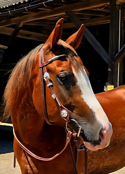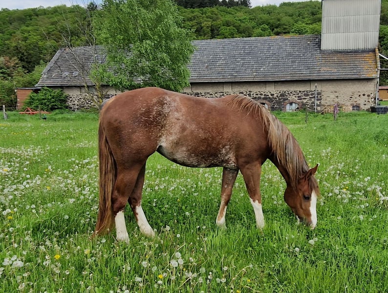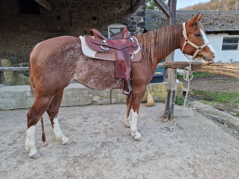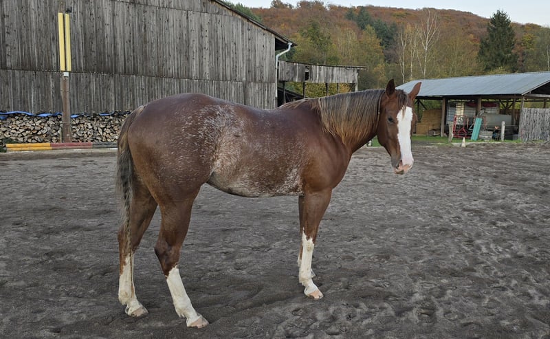 Honey, eine Quarter Horse Stute, geb. 26.4.2020, aus den erfolgreichen Eltern Shiners Voodoo x Smart Chic Olena/ Topsail Cody Sorrel rabicano in wunderschöner Optik, ca.155 cm groß. Superhübsche harmonische Stute. Gerade Beine, gute Hufe, toller Rücken und Hals. Schöne Gänge. Sie ist sehr freundlich, unkompliziert mit anderen Pferden, war nie krank, lahm o.ä. und hat keine Gewährsmängel. 5-Panel N/N. Sie wurde spät gestartet (3 1/2 Jahre), hat 6 Monate Profi-Ausbildung und somit eine solide Basis. Gelände kennt sie, auch alleine (hat bereits einen Wanderritt mitgemacht). Sie hat AQHA Papiere und einen Equidenpass. Aufgrund eine Befundes weit unter Wert. Sie ist ohne Einschränkungen reitbar und sicherlich auch zur Zucht interessant. Standort bei Koblenz Absolut Platz vor Preis.