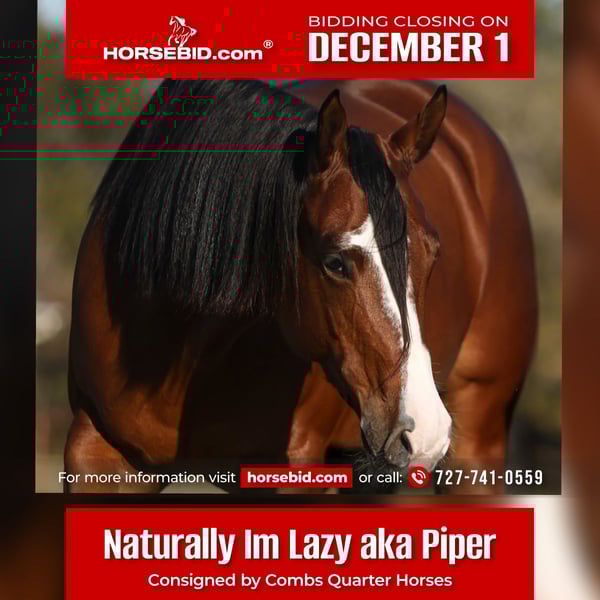 ⚜️ 𝓽𝓱𝓮 𝐇𝐨𝐫𝐬𝐞𝐦𝐚𝐧'𝐬 𝓢𝓱𝓸𝔀𝓬𝓪𝓼𝓮⚜️ Happening now thru MONDAY | DECEMBER 1st - Available EXCLUSIVELY on HorseBid's website! For more details and to register visit: www.Horsebid.com CONSIGNOR CONTACT: Combs Quarter Horses 727-741-0559 LOCATION: Cleburne, TX BREED: AQHA REGISTERED: Yes REGISTERED NAME: Naturally Im Lazy COLOR: Bay HEIGHT: 15.2 AGE: 5 GENDER: Mare Extremely fancy tried and true all around AQHA mare you can show and get noticed with! Naturally I’m Lazy (Lazy Loper x Natural Instincts) “Piper” is a stunning 5yr old 15.2h bay mare by the one and only superior western pleasure and leading producing stallion, Lazy Loper! Piper is out of an own daughter of AQHA multiple champion sire Natural Iron. This young lady was no accident. She was put on this earth to be this amazing! DISPOSITION: Piper has the most amazing, in your pocket personality with an “old soul” disposition! Loves people and attention. Loves kisses and muzzle scratches. She will lay her head on your chest and just close her eyes getting loved on! If ever there was a young horse with a “child’s horse” potential.. this would be her! She has been ridden by smaller children with limited experience. She was flawless! A little more whoa than go. ENGLISH EXPERIENCE: Piper has a very natural way of moving for the English pleasure/ huntseat. She’s got a lovely floating trot and a beautiful flat canter. Piper has also been lightly started in the hunters with limited show miles. She is confidently jumping around 2ft currently with absolutely perfect knees! This young lady is showing a lot of promise in making a phenomenal hunter! WESTERN EXPERIENCE: Piper has been very well started and lightly shown in the western pleasure, the ranch and the trail. She is extremely honest in the trail and waits for her riders cues. Doesn’t get amped up or excited. Piper is also a phenomenal ranch rider. She can do this in her sleep. She’s just absolutely amazing! From her jog to her lope to her super easy transitions. She packs her head low and level without any fuss or fight. Piper is also great out on the trails! She’s not easily spooked or bothered by wildlife or common things one might see on a trail ride. Piper is quiet riding anywhere in the pack and she stands tied at the trailer for tacking and untacking like a lady. She doesn’t even mind naughty goats or rambunctious dogs. UPKEEP: Piper is an easy keeper. She eats 1 1/2 scoops of a basic pellet and alfalfa hay. No supplements or maintenance required to keep her sound. UTD on everything and wearing front shoes as a personal preference. We do have her in aluminum wedges to enhance her beautiful flat knee movement. She has previously been barefoot without any issue at all! TURNOUT: Piper is very friendly and bubbly in the turnout. She’s not fussy or mean with other horses. She is quiet and gentle enough to go out with the smallest ponies to the biggest drafts. GROUND MANNERS: Piper has great ground manners. She can be and has been lead around by small children. She’s careful and watches where she puts her feet. She’s great for washing, grooming, saddling and bridling. She will stand single tied or crosstied. BAD HABITS/ VICES: Piper has NO bad habits or vices. No buck, rear, bolt, bite or kick. TACK: Piper rides bareback, English or western. She will ride in a halter, snaffle or even a port bit. She’s not fussy at all!