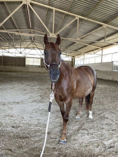 We are selling our wonderful Quarter Horse/Selle Français cross mare, born in 2020, with a heavy heart. She is a spirited yet confident horse with great talent across various disciplines. Under saddle, she is sensitive and refined, which is why she requires a rider who works with feel and without pressure. When ridden correctly, she is a reliable partner with significant potential. In the field, she is completely straightforward both alone and in a group, happily leading the way and showing no fear whatsoever. She has a solid basic training, including dressage work, lunging, small jumps, working equitation from the ground, and extensive ground work. Currently, she is in training and being further developed in the Western riding style, as we believe this discipline suits her very well. With a height of 16.1 hands, she is a compact build with a strong frame, sturdy joints, and can comfortably carry larger riders. Her price is in the higher range of the listed category. She will only be placed in the best hands. Further information available upon request.