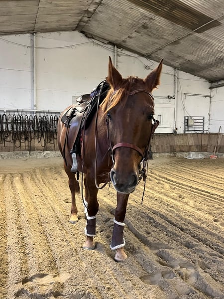 We are selling our wonderful Quarter Horse/Selle Français cross mare, born in 2020, with a heavy heart. She is a spirited yet confident horse with great talent across various disciplines. Under saddle, she is sensitive and refined, which is why she requires a rider who works with feel and without pressure. When ridden correctly, she is a reliable partner with significant potential. In the field, she is completely straightforward both alone and in a group, happily leading the way and showing no fear whatsoever. She has a solid basic training, including dressage work, lunging, small jumps, working equitation from the ground, and extensive ground work. Currently, she is in training and being further developed in the Western riding style, as we believe this discipline suits her very well. With a height of 16.1 hands, she is a compact build with a strong frame, sturdy joints, and can comfortably carry larger riders. Her price is in the higher range of the listed category. She will only be placed in the best hands. Further information available upon request.