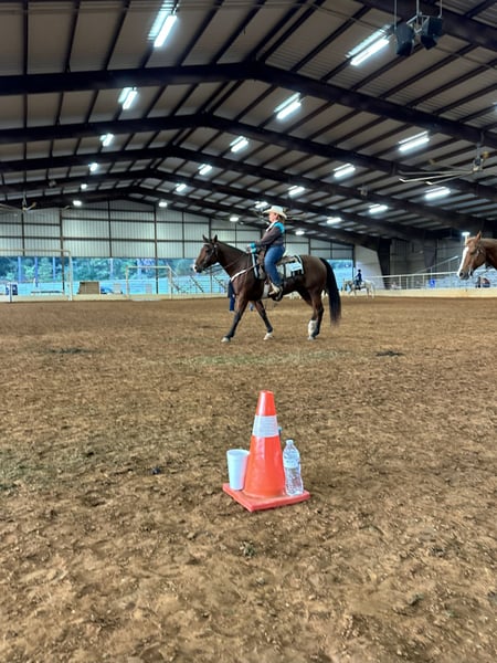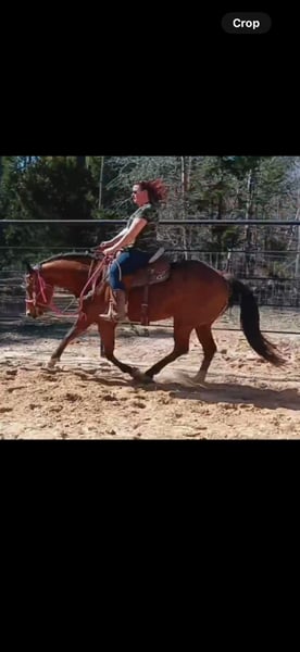 Twister will make a wonderful western all-around horse. She showed in an open schooling show as a 6 year old in the green rider class in November 2025 and placed 5th in the Trial Class and 9th in the Western Pleasure Class. She has the ability to do much better in shows with an experienced western pleasure rider. Twister was trained in 2023 as a western pleasure horse and has a nice slow and low trot and lope if you know how to ask for it.