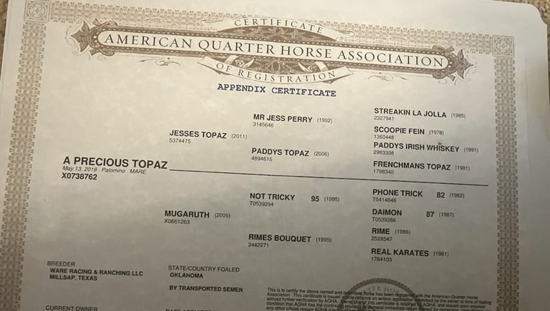 ONLINE AUCTION Place your bids at www.PlatinumEquineAuction.com Starting Bid $3500 Auction ends September 8th, 2024 Need a new saddle? Check out White Rock Saddles on our website or Facebook! A Precious Topaz, here is rare opportunity! Precious is a 2019 AQHA mare standing 15.1. She is by the great Jessie Tooaz who stands at the 6666 ranch. His foals are eligible for Royal Crown Incentives, Gold Buckle Futurities, Riata, Ruby, and Pink buckle, Future Fortunes, Select Stallion Stakes, and NRCHA Stallion stakes. His Sire, MR JESS PERRY SI 113. AQHA Hall of Fame winning himself $687,184, his foal crop has over 1,028 winners, earning $62,290,287. The AQHA #3 All-Time Living Sire of Money-Earners. His Maternal Grandsire PADDYS TOPAZ is sired by PADDYS IRISH WHISKEY, NCHA earner of $12,149. An NRCHA All-Time Leading Sire, siring earners of $1,600,000. Precious was started as a three year old and then sent out to pasture to mature. She has been brought back and is doing great. Precious really has the demeanor to go in many directions. She is the perfect cow/run cross everyone is looking to get! They’re even harder to find with this calm mindset and personable deamor. She lopes both directions, wants to give to all pressure each way, has sliding stop and light in the bridle. She had the most correct start and the talent to go any direction you would like to take her. If you want barrel horse or any type of performance horse that has a calm and quiet mind this is her. She is eager to learn new things and is very smart, she picks up things easy and retains what you show her. She has the brain of a champion doesn’t forget anything, and wants to please you with each time you take her out.I would say she could be ridden by novice riders who have guidance, she is trustworthy and has a great slow pace! She has zero issues and handles long periods of time off. Precious is truly a diamond in the rough and will shine no matter which direction she is taken. Please contact Longhorn Ranch Dina 831-537-1915 located in Paicines, CA with any question or to schedule an appointment to come meet Precious. ONLINE AUCTION Place your bids at www.PlatinumEquineAuction.com Starting Bid $3500 Auction ends September 8th, 2024 Need a new saddle? Check out White Rock Saddles on our website or Facebook!