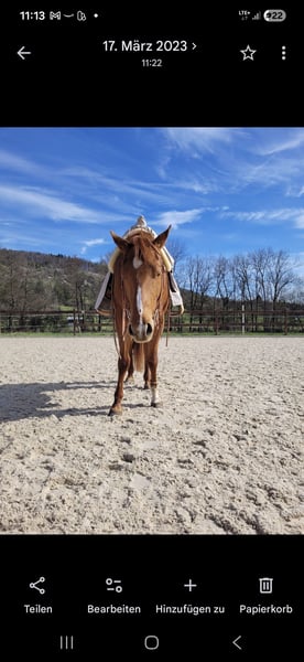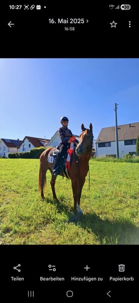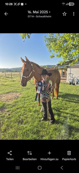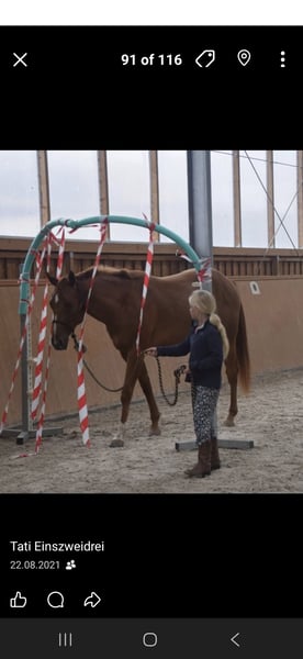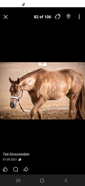 Wunderschöne Allround Quarter Horse Stute – erfolgreich bis LK2, kinderlieb & absolut zuverlässig Zum Verkauf steht meine Quarter Horse Fuchsstute (geb. 04/2019, ca. 1,60 m), abstammend von Ain't It The Blues aus der Pleasure Mary Sie ist seit Geburt in meinem Besitz und wurde mit viel Zeit, Ruhe und System zu einem vielseitigen, ehrlichen und leistungsbereiten Allroundpferd ausgebildet. ✨ Ausbildung & Erfolge erfolgreich bis LK2 vorgestellt Futurity: erfolgreich i.H. geshowt Fohlenschau-Siegerin, 2019 Fohlenchampionat in Aachen hoch platziert ausgebildet in: → Western Pleasure → Horsemanship → Trail → Showmanship zusätzlich im Ranch Riding geshowt – zeigt hier ebenso viel Talent Sie ist sehr arbeitswillig, fein zu reiten und stets motiviert, benötigt dabei aber einen fairen, gefühlvollen Reiter. Charakter & Alltag absolut brav im Umgang und unter dem Sattel. Kinderlieb, wurde auch von Kindern geritten & auf Turnieren vorgestellt sehr menschenbezogen und ehrlich verladefromm (geht jederzeit alleine in den Hänger) schmiede- & alltagssicher kennt Hunde und andere Tiere Im Gelände ist sie sehr zuverlässig, geht auch alleine entspannt ins Gelände und ist für alles zu haben – selbst Baden im See, extrem Trail usw ist kein Problem. Haltung aufgewachsen im Aktivstall aktuell Paddockbox mit täglichem Auslauf sehr sozial verträglich, rangmäßig im Mittelfeld Ich sehe sie idealerweise in einer Haltung, in der sie sich frei bewegen kann (z.B. kleiner Offenstall). Ausbildung am Boden solide Bodenarbeit & Freiarbeit kennt Doppellonge regelmäßiges Training u.a. bei Lara Tauer (Mustang Makeover) Geht frei alle seitengänge, kann abgerufen werden, kompliment, spanischer schritt, galoppiert an der Hand. Piaffieren spielerisch angefangen. ❤️ Gesundheit PSSM2 n/P2 (Einzelgenträger) – symptomfrei vollständig ausgeheilter Griffelbeinbruch (Röntgenbilder vorhanden) Für wen geeignet? Ein ideales Pferd für: ambitionierte Freizeit- und Amateurturnierreiter Jugendliche / Kinder Reiter, die ein verlässliches, vielseitiges Allroundpferd suchen Sie ist kein Pferd für reinen Leistungsdruck, sondern für jemanden, der mit Gefühl reitet und ihre Qualität zu schätzen weiß. Sonstiges läuft barhuf und beschlagen Umfangreiches Zubehör kann miterworben werden. Ich gebe sie nur aus gesundheitlichen Gründen (meinerseits) ab. Sie ist für mich ein absolutes Herzenspferd und wird nur abgegeben wenn wirklich alles passt. Ich wünsche mir einen Platz, an dem sie weiterhin gefördert und geschätzt wird. Mehr Bilder und natürlich Videos sind vorhanden und versende ich gerne bei ernsthaftem Interesse.