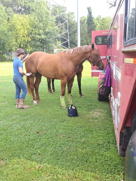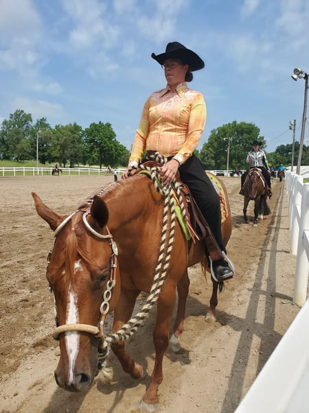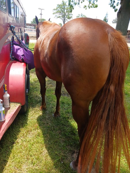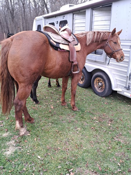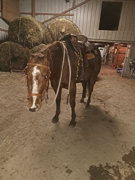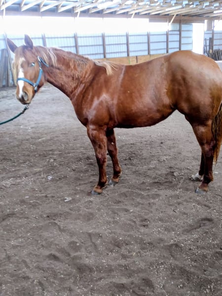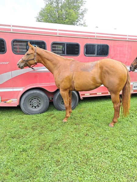 "AVAILABLE ON ONLINE HORSE AUCTION AT www DOT MagicHorseAuction DOT com BIDDING OPEN NOW thru TUESDAY | October 14TH! - BUY IT NOW AVAILABLE! *Final price will be determined on auction site* CONSIGNOR CONTACT INFO: Sarah Collins 419-822-7526 LOCATION: Walbridge, OH First things first Sage CAN be registered AQHA. Her sire is Kissin the Girls, who needs no introduction, and her dam is Only Invite the Hot. I have raised this one of a kind mare since she was 4 months old. Life simply got in the way of me continually procrastinating registering her. Sage is 16.2 hands and built like an absolute house. No pictures can do this true all around mare her full justice! Sage began her show career as a yearling in Showmanship and Halter. Sage was shown in ranch, western and English pleasure, horsemanship, equitation and trail until she was a 4 year old. Sage does patterns excellent as well. Sage was never pushed or overworked. She was raised the right way and broke to ride slow and correct. Her jog/long trot is finished for pleasure shows. Her lope needs a tune up for Western pleasure but is ranch or English ready. You can show this mare all day with very little prep. Her stamina never wears out! She LOVES the show pen and knows her job well! She rides one handed and is spur trained. Extremely responsive to leg while doing a 360 or sidepass. Sage truly does everything! Sage is very accustomed to the show life and hauled all over showing in all the events. On the trails she crosses whatever is in her path including logs, bridges, mud and water. She will follow, go in the middle or lead all while riding on a loose rein. Sage carefully places her feet while taking care of her rider. Sage is a true DIY horse and can sit for months at a time and will ride exactly the same way, every time. She remembers her training and stays broke! She is traffic safe, accustomed to tractors, motorcycles, bikes and four wheelers. Her entire life she has received the best care, regular vaccines, wormer and hoof care. Shes never worn or needed a shoe, even on rocky terrain. Never taken a lame step. Regularly maintained with chiropractor and massages. Never injected or any other maintenance. Sage is in a mixed herd with 24/7 turnout on grass hay. Very easy keeper on 6 pounds grain daily. Sage also stalls phenomenal without cribbing, pawing or kicking. Sage will meet you at the gate everytime in any size field. She clips great (twitch for ears), loads, bathes and ties. Absolutely no holes or vices in this mare! The ONLY reason this gorgeous mare is being sold is due to me suffering a back fracture in 2023. It's not fair to this mare to sit in a field or be an occasional trail horse. I can answer any and all questions about her by calling Sarah Collins 419 822 7526. Transportation can be arranged anywhere using safe, well known haulers. Don't pass up this iconic mare with her whole show career ahead of her and then can produce top quality foals.