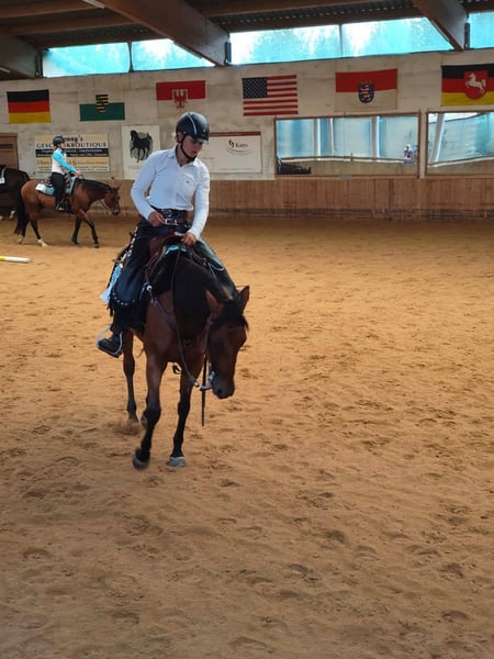 GREAT WALLA WALLA di WallaWallaShine (pronipote di TopsailWhiz) https://www.allbreedpedigree.com/great+walla+walla Il cavallo da sogno di Lea e dei suoi altri cavalli. In show LK 1. 150 cm, 7 anni. Vice Campione di Ranch Riding EWU - Prima Unione Western Rider, Regione Saxony 2025, e altre placings. Ha partecipato agli Europei e alle GO. Dolce, volenterosa, giovane e ben addestrata. Le discipline in cui eccelle sono Ranch Rail e Ranch Riding, ma si comporta bene anche nel Trail. Ha anche molto potenziale per il Reining, anche se non l'abbiamo mai provato. Un aspetto negativo: ha l'asma, e lo stress, insieme alla cattiva qualità dell'aria e alla polvere nelle competizioni, non le fanno bene. Non vogliamo mettere a rischio la sua salute forzandola a prestazioni. Per questo motivo, dobbiamo cercarle una nuova casa come cavallo da tempo libero o con una gestione di gara adeguata nel paddock e percorsi più corti. Preferibilmente con l'accesso al pascolo o con una paddock box adeguata. Il prezzo è proporzionato all'età e all'addestramento, ed è relativamente basso. Si prega di contattare solo seriamente e con motivazione al numero 01511 6544405.