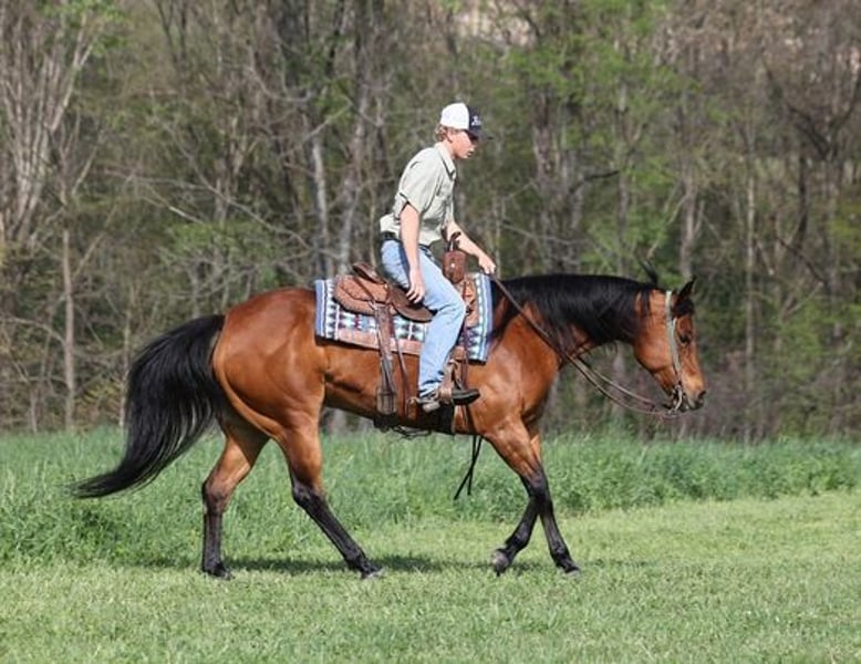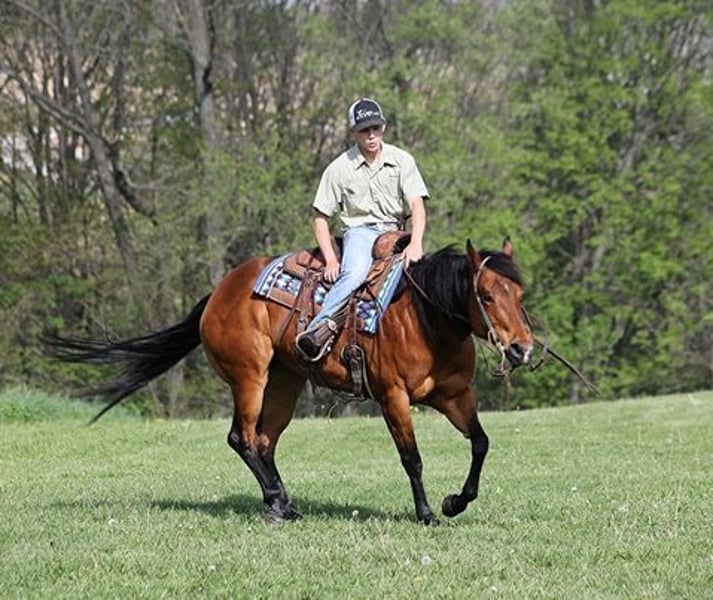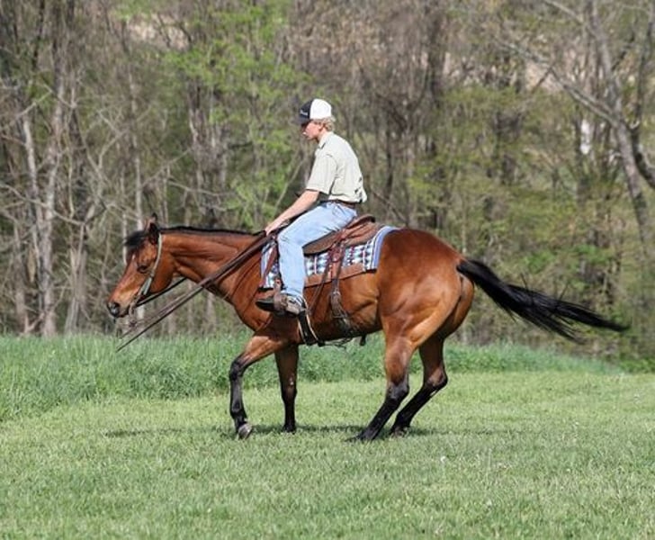 Dancers is a beautiful blood bay mare standing around 15hh. She is a 2015 Model and she is registered in the AQHA with a good pedigree that goes back to Shining Spark on the top and Doc Bar on the bottom. Dancer has had extensive reining training and is ready to go into the show pen. She spins correctly both ways, has a good slide stop and would excel in the ranch riding as well. She is push button trained and is easy/uncomplicated to ride! She has been started in the cutting pen and has plenty of cow-sense. She would be a great team sorter or heel horse if someone wanted to use her for that as well. She has been used around the ranch and she can handle any job that is asked of her. She can be used to go out in the pasture and rope off of and she will trail a cow. Dancer is an excellent trail horse. She will cross creeks, ditches, logs and navigate rough rocky areas. She is safe riding in traffic. She has a smooth jog, a very smooth lope where she rides with her head down on a draped/loose rein, she will do flying lead changes and backs with ease! Dancer is a confident horse on the trails and will lead the crew, head out alone with no issues! She has been exposed to all kinds of wildlife such as deer or turkey and will go anywhere that he is asked too. She has encountered every obstacle possible on the trail. She will go up or down even the steepest slopes, across deep creeks, over downed trees, and over all types of rough terrain while still being sure footed. Dancer has never been cinchy, cold backed, does not crib or weave. Dancer is a horse that anyone should enjoy and she can do it all from the reining, ranch riding, cutting, team sorting, roping, ranch work, or just hit the trails!!