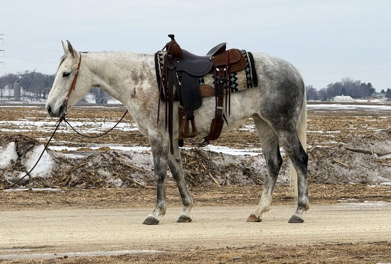 💎 𝐓𝐇𝐄 𝓓𝓲𝓪𝓶𝓸𝓷𝓭 𝐒𝐇𝐎𝐖𝐂𝐀𝐒𝐄 💎 Happening now thru MONDAY | FEBRUARY 23rd - Available EXCLUSIVELY on HorseBid's website! For more details and to register visit: www.Horsebid.com CONSIGNOR CONTACT: Gabriel Murphy 320-339-1458 LOCATION: Cannon Falls, MN BREED: Quarter horse REGISTERED: No REGISTERED NAME: Misty COLOR: Grey HEIGHT: 14.3 AGE: 9 GENDER: Mare Misty Misty is a beautiful nine-year-old grey grade mare with the kind of disposition everyone is looking for. She’s gentle, low-headed, and incredibly sweet to be around. Easy to catch, easy to handle, and always willing — she’s the type that fits right in with the whole family. Misty has done a little bit of everything. She’s been used to push cattle and load trucks at the sale barn, has spent plenty of time out on the trails, and has been hauled to 4-H and fun shows. She’s competed in barrels and poles and handles it all with a calm, steady mindset. Whether you’re riding inside the arena or out in the open, she stays the same honest, reliable mare every time you swing a leg over. In the arena, Misty takes both leads with ease, lopes a nice collected circle, has a smooth jog, and an easy, ground-covering walk. She neck reins nicely, rides around on a loose rein, and listens well to voice commands. She’s soft in the face, responsive, and forgiving — making her a great confidence builder for younger riders while still being enjoyable for an adult to ride. Out on the trail, Misty is as dependable as they come. She’ll cross water, step over fallen trees, go up and down hills, and handle rough terrain without hesitation. She’s sure-footed and not spooky, making her a trustworthy partner anywhere you point her. Misty gets along well turned out with other horses and is quiet and content in the stall. She stands tied, stands for the farrier, loads and hauls well, and handles everyday ranch life like a pro. If you’re looking for a safe, all-around mare your kids can enjoy this summer — or one you can saddle up and enjoy yourself — Misty checks all the boxes. She’s the kind that’s hard to find and even harder to let go.