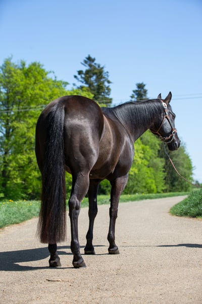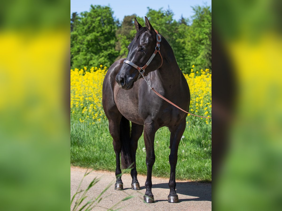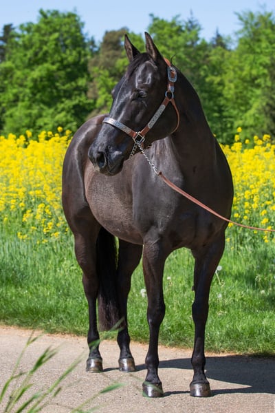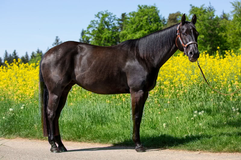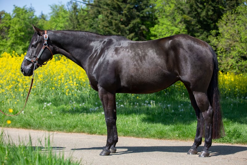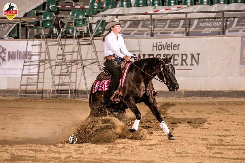 Wunderschöne korrekte Stute mit besonderer Ausstrahlung, Profi Training, brav und unkompliziert im Umgang. Doppelt registriert (AQHA und APHA)! Smart Chic Olena und Hollywood Dun It auf dem Papier. Zu ihrem guten Galopp hat sie auch noch einen außergewöhnlich schönen Trab und Schritt mit langem Vorderbein und gutem Untertritt. Sie hat in ihrer relativ wenigen Reitzeit eine Reining Ausbildung erhalten und wurde auch schulungsmässig schon geshowd (Jungpferde Reining gewonnen). Sie ist allerdings nicht einhändig "ready to show". Hierfür fehlt ihr das Finish und die kontinuierliche gewünschte Körperhaltung (Open Bereich). Stoppen fällt ihr sehr leicht, was bisher kaum trainiert wurde. Sie war bisher zwei/drei mal brav im Gelände, auch alleine. Ich habe sie während der Corona Zeit decken lassen und später noch einmal. Sie hat zwei tolle Nachkommen bei mir (per TG). Die Nachzucht (von Spooks Gotta Whiz, bay und Bet Hesa Boon, blue roan) kann besichtigt werden. Sie ist eine vorbildliche Zuchtstute, die ihre souveräne Art auf die Fohlen überträgt. Farbtest: aaEe Video auf Anfrage