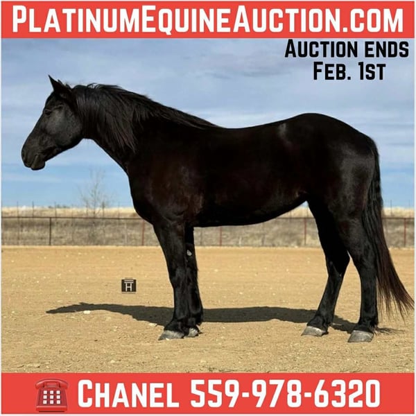ONLINE AUCTION Place your bids at www.PlatinumEquineAuction.com Starting Bid $3500 Auction ends February 1st, 2026 Need a new saddle? Check out White Rock Saddles on our website or Facebook Annie is a one of a kind mare with an amazing demeanor and willingness about her. She is a 9 year old jet black draft cross mare standing 16 hands. Annie is safe, sound, willing, smart, and the absolute sweetest. She will babysit a greener rider or take a more advanced rider as far as they want to go. Annie is started over fences and absolutely loves to jump. She is smooth and sensible and can take a joke. I have taken Annie fox hunting and she will go anywhere, jump anything, and is as safe and sure footed as can be. She can get up and go or hang back and go slow. Stands quietly at the checks. We have taken Annie out on the ranch and gathered cows. She is traffic safe. You can leave her off for as long as you want and jump on and go. She has absolutely no funny business to her and is extremely well mannered. She is light and responsive and easy to ride. We truly have nothing but amazing things to say about this mare. She is sound, straight and clean legged. Great feet and bone to her. UTD. She lives with other horses with absolutely no issues. Easy keeper. FMI call/text Chanel with Holland Horse Company at 559-978-6320. ONLINE AUCTION Place your bids at www.PlatinumEquineAuction.com Starting Bid $3500 Auction ends February 1st, 2026 Need a new saddle? Check out White Rock Saddles on our website or Facebook