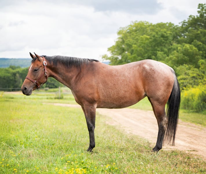 "AVAILABLE ON ONLINE HORSE AUCTION AT www DOT MagicHorseAuction DOT com BIDDING OPEN NOW thru TUESDAY | October 28TH! - BUY IT NOW AVAILABLE! *Final price will be determined on auction site* CONSIGNOR CONTACT INFO: Lexi Younger 585-698-0458 LOCATION: Geneseo NY """Mattie"" is a super sweet mare ready for her next home! She is an 8 year old AQHA Mare, standing 15.1hh and stout. She is a beautiful bay roan with unique markings throughout her body, a brand, and a coon tail. Mattie has been in a professional trainer's program for two years full time while being shown by an amateur rider. She has successfully shown in various ranch events, including ranch rail, ranch riding, ranch showmanship, ranch trail, ranch reining, halter, boxing, and box drive box cattle classes as well. She has earned multiple weekend Champion and Reserve Champion titles! At home, Mattie is the easiest horse in the barn in terms of care. She is the epitome of ""fat on air"" and can be stalled or turned out with other horses. She will run to the gate to greet you in the pasture! In the stall she is quiet and has zero bad habits. She is not on any medications. She was shod all the way around during show season, but has been barefoot for two months now and is still 100% sound. She is extremely personable and her personality does not change whatsoever when she is in heat. She loves to be groomed and will stand quietly tied or on the cross ties. She also does all of the other basics such as bathing, clipping, great for the vet and farrier, and will load right onto a horse trailer. She is an easy push ride under saddle and about as broke as they come! She has all the bells and whistles and could continue showing in the ranch or cattle classes. She's WTL and has all of the extended gaits for ranch, will open gates, drag a log, spin, sidepass, and has the start of a lead change. She has some experience in competition sorting and we have also pasture sorted cattle with her as well! She has some trail experience in a group setting. She is forward on the trail but quiet and will go all day! She would excel in a show home, family riding setting, or produce some nice foals!"
