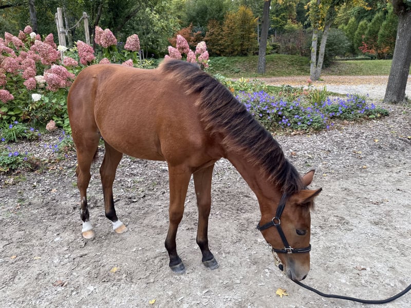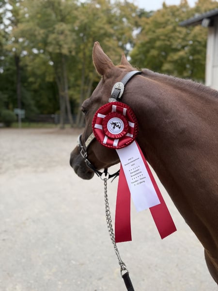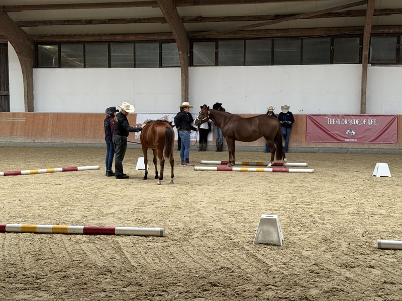 On March 11, 2025, Margie was born. Margie is a bay American Quarter Horse filly, double registered. Sire: GUNSPARKS (Gunners Crome Sun) Dam: LDR DUNIT IN THE GUN (Guns of Enterprise) Studbook I Premium Mare PHCG Champion Mare Show Studbook II Premium Mare DQHA Champion Mare Show Participant in the Federal Mare Championship - 2nd place She is correctly built, shows athletic movements, and is bred for Reining and Allround. Margie is growing up in a loving hobby breeding environment with herd living. She is familiar with dogs, tractors, farriers, veterinarians, and 24-hour pasture access at the time of sale. Margie has partially blue eyes. She is tested 7 Panel N/N. At the time of sale, she will possess a DQHA passport and AQHA/APHA papers. Additionally, she has been tested by Laboklin for Lethal White Overo (LWO) and Splashed White N/N. She is learning the basics of being a foal and will be placed in a good home after weaning in October. Our horses receive high-quality feed that supports optimal care for tendons, joints, and bones. Margie's half-sister is also available for viewing. Margie was presented at the Paint Horse Foal Show on September 6, 2025, in Könnern. Here, she impressed with her athletic gait and perfectly muscled body, receiving a score of 8.10. Thus, she is classified as a premium foal. She placed 2nd in the filly class and was the 2nd best foal out of 18 at the entire foal show. We wish for Margie to find a 5-star home, preferably with support in sports. For more details, as well as pictures/videos, please feel free to contact us. The best way is to come by in person and get to know her. 015151173110