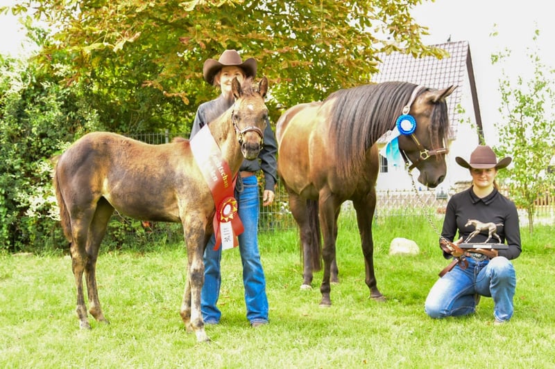 Expressive, stunning AQH mare seeking her 5-star home from November/December. Josie was born on May 1st, 2025, and is a correctly built, light-footed, personable little mare in the dream color Dark Buckskin. She is currently growing up appropriately in a mixed herd and is already halter-trained. Hoof handling, leading, and loading have also been practiced diligently. At the DQHA Höveler Breeding Show 2025, she already caught everyone's eye and presented a very typey AQH, which led to her winning the Sieger Trophy. Her pedigree traces back to the old Quarter line x Foundation / Reining, promising a versatile all-round talent in the future. Both parent horses can be viewed on-site and are tested N/N for 5-panel and 6-panel genetic testing. Josie already has a stylish CORE and will receive a DQHA passport. Please feel free to contact me for further questions.