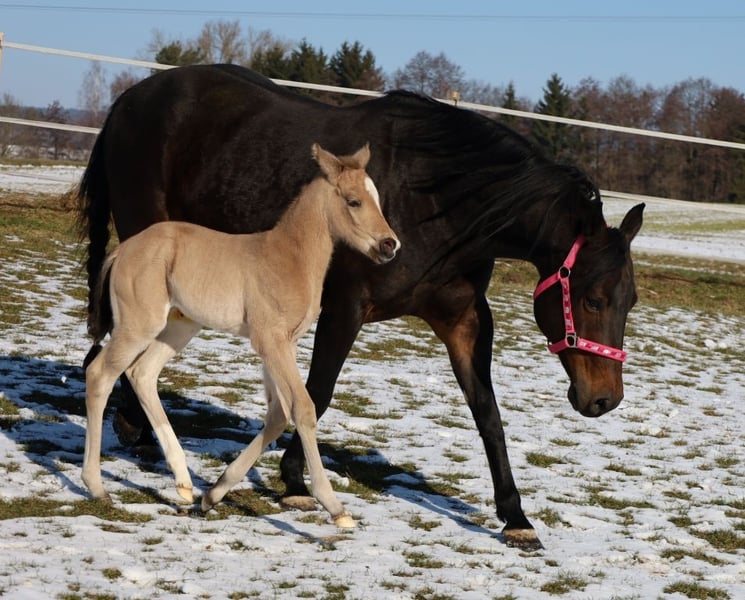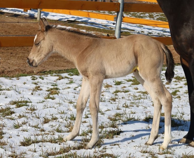 GOTTA LOPIN LUCINDA, born January 26, 2026, Buckskin Our "Liz Gotta Gun" (Lisbeth) and our "Blackberry" have created an incredibly sweet filly – a pairing that simply couldn’t be more fitting. Lucinda has inherited all the positive traits from her parents: correct conformation and movement, lots of charm and presence, and great potential in movement. She is sure to become a reliable riding partner, just like her parents, making her an excellent choice for a horse-loving family to enjoy. She will also be a good riding horse for Reining and Ranch Horse classes, such as Ranch Riding, Ranch Trail, Ranch Rail, and can also excel as an all-rounder. Her pedigree supports this, featuring many high-quality sires and legendary names in Quarter Horse breeding, such as Hollywood Dun It, Grays Starlight, Smart Little Lena, Continental King, and King P-234. Her AQHA papers are available online and will be sent to us shortly. She will be microchipped soon, and the DQHA equine passport including breeding certificate will be applied for. Both parents have undergone 5-panel testing and IMM/MYH1 testing. Like all our foals, she is raised with peers and other horses in a herd and is handled by knowledgeable caretakers. Regular deworming and hoof care appointments are standard practice here. In case of sale, she will be insured for life, including a veterinary health certificate. Costs and risks remain with us until she is handed over, which will be after she completes her sixth month. Upon request and at the buyer’s expense, she can be entered into the NRHA Futurity and NSBA programs (possible from this year), as well as the EWU Young Horse Program. Her parents and several half-siblings can be visited at our farm. The last photos show her parents. Phone: 0170/4443194 Many pictures and more information are available at www.goetz-quarterhorse.de