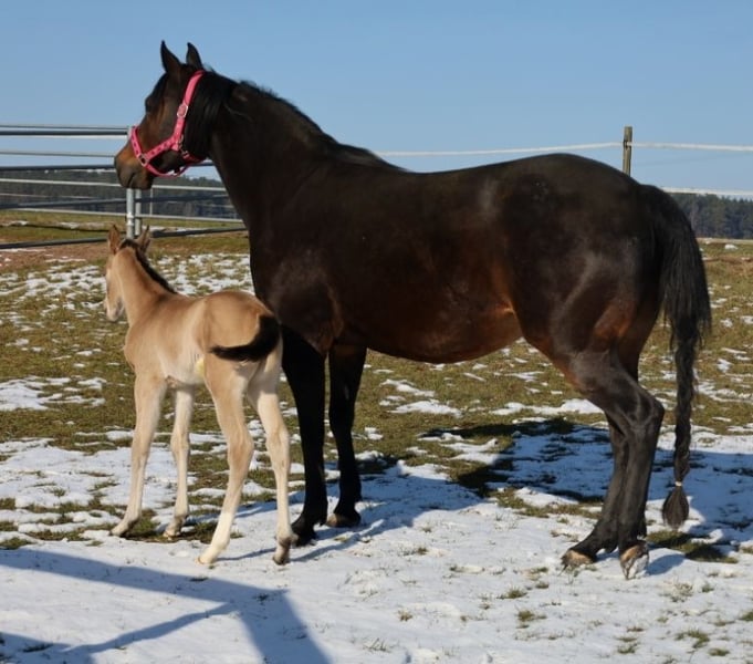 GOTTA LOPIN LUCINDA, urodzona 26.01.2026, buckskin Na tym naszym pastwisku „Liz Gotta Gun“ (Lisbeth) i „Blackberry“ stworzyli naprawdę słodką klaczkę urodzoną z miłości – można tylko powiedzieć, że ta krycia była idealna. „Lucinda” odziedziczyła po rodzicach wszystkie pozytywne cechy: poprawną budowę ciała i ustawienie kończyn, dużo uroku i charakteru, potencjał ruchowy, a z pewnością będzie niezawodnym partnerem do jazdy, tak jak jej rodzice, co z pewnością sprawi, że miłośnicza jazdy rodzina będzie z niej bardzo zadowolona. Będzie także doskonałym koniem do jazdy w reiningu i klasach ranch horse, takich jak Ranch Riding, Ranch Trail, Ranch Rail, a także w sportach wszechstronnych. O tym świadczy także jej rodowód, w którym znajduje się wiele wysokiej klasy reproduktorów i legend hodowli Quarter Horse, takich jak Hollywood Dun It, Grays Starlight, Smart Little Lena, Continental King i King P-234. Dokumenty AQHA są dostępne online, a wkrótce zostanie ona oznakowana chipem i otrzyma paszport DQHA wraz z zaświadczeniem hodowlanym. Oboje rodzice przeszli test 5-panelowy oraz test IMM/MYH1. Jak wszystkie nasze źrebięta, dorasta w stadzie z rówieśnikami i innymi końmi, pod opieką doświadczonych wychowawców. Regularne odrobaczanie i wizyty u kowala są u nas standardem. Przy sprzedaży zapewniamy ubezpieczenie na życie wraz z zaświadczeniem lekarskim o stanie zdrowia. Koszty i ryzyko pozostają u nas do momentu przekazania – czyli do końca 6. miesiąca życia. Na życzenie i na koszt kupującego możliwa jest wpłata na program Futurity NRHA i NSBA (od tego roku dostępne) oraz program młodych koni EWU. Jej rodzice i kilka półbraci są dostępni do obejrzenia na naszej farmie. Na ostatnich zdjęciach widać jej rodziców. Tel. 0170/4443194 Więcej zdjęć i informacji na stronie www.goetz-quarterhorse.de