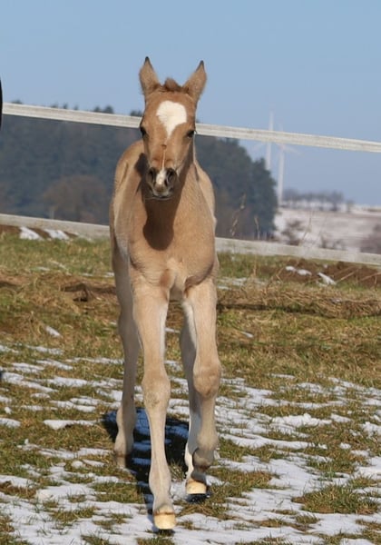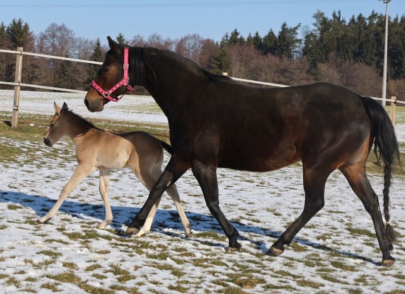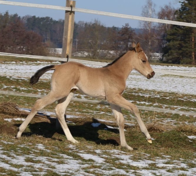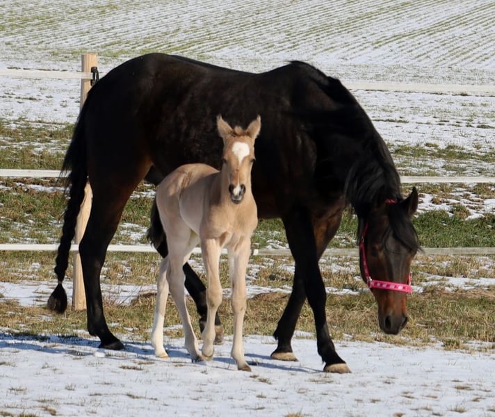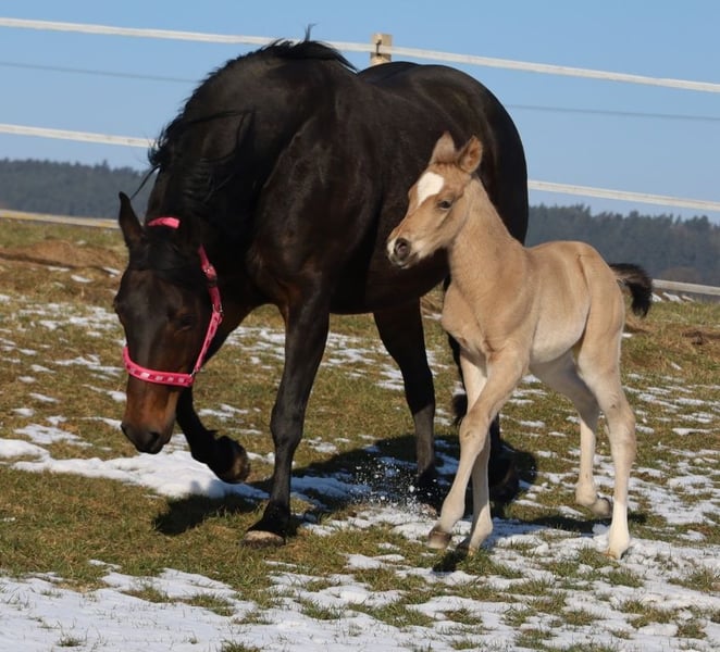 ICE COOL WILLOW, geb. 16.02.2026, buckskin von Ice Cool Hotrod aus der Kings Finest Joy. Da die Anpaarung bereits in 2025 ein hervorragendes Fohlen heraus brachte, wurde diese wiederholt und "Kings Finest Joy" (Halbschwester zu unserem Blackberry) hat dieses traumhaft schöne Stutfohlen von "Ice Cool Hotrod" zur Welt gebracht ❤️❤️❤️. "Willow" ist ein großrahmiges, sehr korrektes Stutfohlen, auf stabilem Fundament stehend, das sich exzellent bewegen kann und den rassetypischen Charme und Ausdruck aus. Ihr Charakter ist einfach zu beschreiben: charmant, extrem menschenbezogen, freundlich, lustig, neugierig und wirklich "icecool". Sie stammt aus der Verpaarung von zwei Leistungspferden im Turniersport und somit dürfte ihr das Talent für den Allround-Sport in die Wiege gelegt worden sein. Ihre Eltern haben unzählige Erfolge im Turniersport. Hier nur einige aufgezählt: Ihr Vater ist vielfacher World Show Qualifier in Halter, Hunter under Saddle, Western Pleasure, Trail und Western Riding sowie auch vielfacher Futurity Champion, Austrian QH Champion, Allround Champion, Grand Champion und Medaillengewinner auf der EM in Kreuth. Ihre Mama hat das Superior und ROM in Showmanship at Halter, war European Champion und Deutscher Meister in Showmanship, DQHA Stutenschau-Siegerin und eingetragen in das Stutbuch 1, World Show Qualifier und hat weiterhin viele Platzierungen in Trail, Pleasure, Ranch Riding, Hunt Seat Equitation und Ranch Trail. ALLROUND-HERZ - WAS WILLST DU MEHR!?! ❤️❤️❤️ Aber selbstverständlich würde sie dem Freizeitreiter ebenso viel Freude bereiten, da sie, wie auch ihre Eltern und ihr Vollbruder, einen ganz tollen Charakter hat. Sie wird artgerecht und sachkundig mit weiteren Fohlen bei uns in der Herde aufwachsen. Regelmäßige Wurmkuren und Termine beim Hufschmied sind bei uns eine Selbstverständlichkeit. Ihr AQHA-Papier ist bereits beantragt, in Kürze wird sie gechipt und dann der DQHA-Equidenpass incl. Zuchtbescheinigung beantragt. Auf Wunsch des Käufers ist auch eine Registrierung bei der APHA möglich, da ihr Papa doppelt registriert ist. 5-Panel-Test und IMM/MYH1 negativ (N/N). Bei Verkauf wird sie lebensversichert incl. tierärztliches Gesundheits-Gutachten. Kosten und Risiko bleiben bis Übergabe (=vollendetes 6. Lebensmonat) bei uns. DQHA Futurity startberechtigt und einbezahlt. Weitere Einzahlungen, z.B. EWU-Jungpferdeprogramm, NSBA, PHCG-Futurity-Programm usw. gerne auf Wunsch des Käufers. Tel. 0171/4241309 oder 0170/444 3194