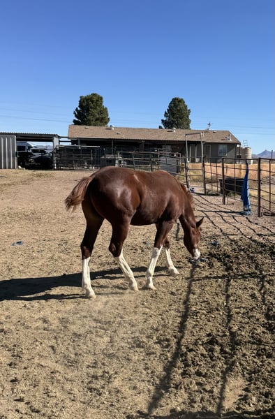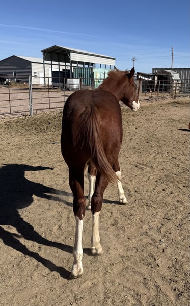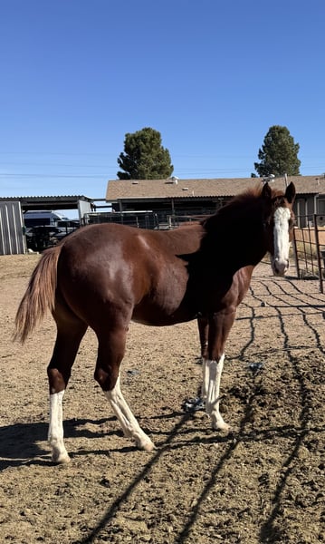 Scooter Testing the waters on my 8 month old colt. Please no judging, I have had many health issues that has deterred me from safely working with him as he got older. I initially started taming him when he was born and he was doing really well, however I never got a halter on him. I am attempting to work with him currently. He is absolutely gorgeous, one blue eye, one brown eye, 4 white stockings. Papers are in progress with AQHA and APHA. His registered name is Scooter Be Lucky. His sire is Ridiculousness from the Rockin J Bar S Ranch in Phoenix. Ridiculousness; picture included 2021 APHA/AQHA/PtHA Bay Overo Stallion APHA ROM COLOR & HALTER 2022 PAC WORLD CHAMPION HALTER STALLION 2022 APHC STATE CHAMPION - YEARLING STALLIONS 2023 APHA RESERVE NATIONAL CHAMPION HALTER STALLION 6 Panel Negative - Herda/n KMW Chancez Are x Sheza Mighty Alrighty Dam; Mariposasambitions - AQHA Sire Premieres Classic Dam. Sheza Mariposa Clem The way he is now he is worth $5,000. I will consider reasonable offers. Will also consider $3000 cash and a 6 month old angus steer. We are located in McNeal, Az