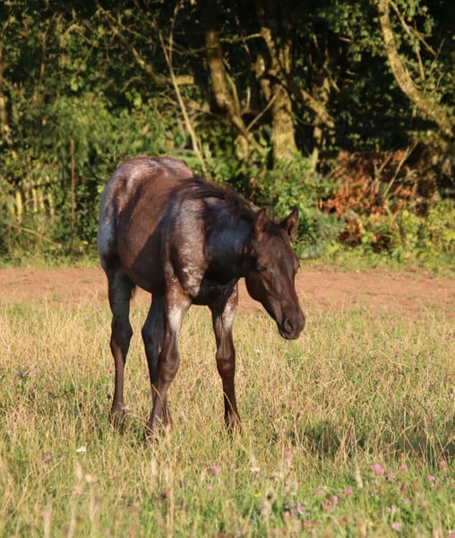 Just Be Blue Sky - dieses bildhübsche Quarter Horse Hengstfohlen, geboren am 9.4.2025, beeindruckt in der auffälligen Farbe Blue Roan und wird voraussichtlich ein Endmaß von 150 bis 154 cm bekommen. Blue ist über seine Eltern 5-Panel n/n. Er wächst gesund und artgerecht im Herdenverband mit anderen Fohlen auf. Bei Abgabe wird er altersgemäß geimpft und entwurmt sein. Kennt dann den Tierarzt und den Hufschmied. Mit seinem lieben Charakter verzaubert er die Umwelt. Ist verschmust sowie cool und erkundigt gerne seine Umwelt. Blue wird täglich gehändelt und benimmt sich dabei brav und unkompliziert. Beim Toben zeigt er jetzt schon seine tollen Bewegungen. Dank seiner guten Allround Abstammung wird er sich voraussichtlich sehr gut für den Sport oder/und als treuen Freizeitbegleiter eignen. Wird mit vollen AQHA Papieren und Equiden Pass abgegeben.