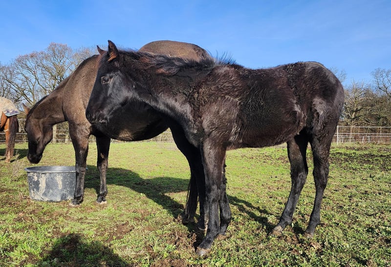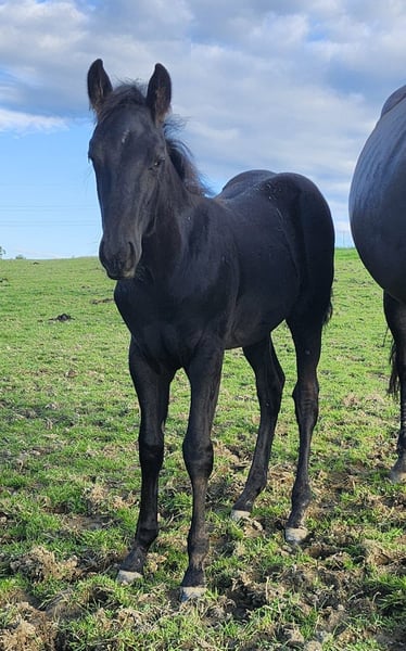 Drifts To The Future ist ein bildhübscher American Quarter Horse Hengstjährling, geboren am 05.06.2025. Er ist schwarz (black) mit nur wenigen Stichelhaaren an der Stirn und genetisch homozygot black sowie homozygot agouti. Die AQHA-Papiere sind beantragt, das zu erwartende Endmaß liegt bei ca. 162 cm. Der junge Hengst überzeugt durch ein korrektes Gebäude, eine sehr gute Entwicklung, ausgewogene Bemuskelung und starke Knochen. Midnight wird später auch größere Reiter problemlos abdecken können. Seine Grundgangarten sind gut und taktsicher, er lernt schnell und bringt ein ausgeglichenes, angenehmes Temperament mit. Charakterlich ist Midnight ein echtes Goldstück. Er ist sehr menschenbezogen, stets freundlich, ruhig und gelassen und meist der Erste, der einen am Weidetor begrüßt. Er möchte gefallen, ist sehr brav im Umgang und zeigt sich jederzeit kooperativ. Er wächst im Herdenverband auf, kennt das Fohlen-1x1, ist halfterführig und kennt sowohl Tierarzt als auch Hufschmied. Er ist gesund,regelmäßig entwurmt und 6-Panel n/n getestet. Abstammungsmäßig ist er etwas ganz Besonderes: Er ist der einzige Sohn von Drifts Chip in Europa und stammt aus der berühmten 6666 Ranch-Blutlinie, die weltweit für Vielseitigkeit, Leistungsbereitschaft und Rittigkeit bekannt ist. Damit ist er nicht nur für Freizeit und Turniersport, sondern auch für die Zucht hochinteressant. Ob als zukünftiges Showpferd, Sportpartner oder zuverlässiger Freizeitbegleiter - mit seinem Potenzial für verschiedene Disziplinen und seinem außergewöhnlich lieben Charakter ist Drifts To The Future ein echtes Versprechen für die Zukunft.