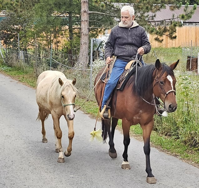 Peppy Doc King Maxen - Dieser 2024 geborene Palomino (Endmaß ca. 148 cm) mit traumhafter weißer Mähne und Schweif ist ein absoluter Eyecatcher - kompakt, korrekt gebaut und mit vielversprechenden Proportionen. Ein Nachwuchspferd, das nicht nur durch seine Optik, sondern auch durch seinen tollen Charakter überzeugt. Er ist menschenbezogen, freundlich, aufmerksam und lernwillig. Im täglichen Umgang zeigt er sich artig, entspannt und unkompliziert. Herausforderungen begegnet er mit Mut und Neugier und lernt schnell. Schon jetzt lässt er sich problemlos verladen und geht ruhig und gelassen an der Hand ins Gelände. Der Hengst wächst gesund und robust im Offenstall in gemischter Herde auf und wird liebevoll und mit viel Sachverstand an seine Aufgaben als Reitpferd herangeführt - nach den Prinzipien des Natural Horsemanship, Schritt für Schritt und ohne Zeitdruck. Die Farbgenetik (e/e, A/a, CH/ch) macht ihn nicht nur farblich besonders interessant, sondern eröffnet auch züchterisch Potenzial. Peppy ist altersgemäß geimpft und regelmäßig entwurmt. Seine Abstammung lässt keine Wünsche offen: Top Cuttinglinien (Enkel von Peptoboonmal) väterlicherseits treffen auf ausgezeichnete Reiteigenschaften mütterlicherseits - eine ideale Kombination für Sport, Turnier und Freizeit. Der Hengst ist DQHA sowie Regional-Futurity startberechtigt und bringt alles mit, um in Zukunft ein vielseitig einsetzbares Reitpferd mit Charme, Talent und Herz zu werden.