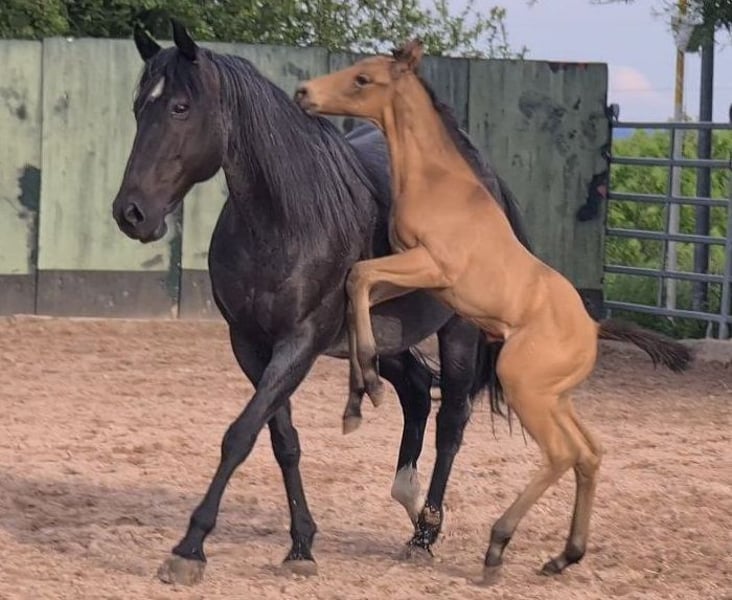 **HES Holywood Hancock** Buckskin colored American Quarter Horse stallion foal *09.05. 2024 estimated height:** 153 cm Western Ranch Horse Classes / Reining / Breeding We are offering a promising American Quarter Horse colt for sale. This young Buckskin stallion, born on 09.05.2024, impresses with his incomparable charisma, conformation and talent for movement. He is already incredibly muscled after just one month, which probably comes from his mother. He also shines with great, strong joints and a stable and correct foundation, measuring 153 cm and excellently suited for western riding. He not only impresses with his eye-catching color, but also with his friendly nature and willingness to learn. This stallion has the potential to become an outstanding partner in western riding and brings with him the best characteristics of his breed. If you are interested or have any further questions, we look forward to hearing from you!