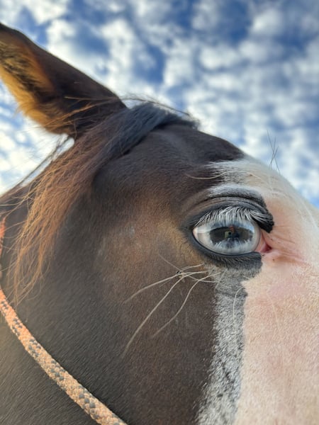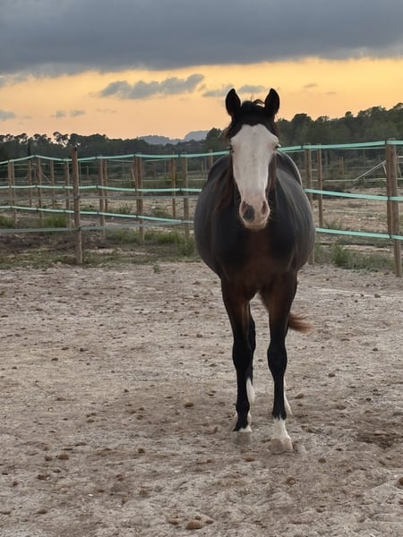 He is an exceptionally typey 2-year-old American Quarter Horse stallion, distinguished by his outstanding temperament: He is not dominant, does not test, and shows no stallion-like behavior. He is very social and so calm and relaxed that even children can ride him out on the trails. His character is truly rare. He is almost a dependable partner already and very easy to handle. • Rides quietly alone in the terrain • Familiar with dogs, tractors, traffic, and machinery – completely fearless • Liberty training / basic groundwork: • Sidepass • Spin from the ground • Backing / sidepass for mounting • Already accustomed to saddle and rider weight • Very cooperative, easy to handle everywhere, polite in manner • Farrier / veterinarian / dentist: → He doesn’t even need to be tied up – so easygoing is he Visually, he impresses with his rare dark bay color, the distinctive Gunner face, two blue eyes, and his already long mane – a real eye-catcher on any riding facility. He is double registered (Paint and Quarter) and was a premium foal. If you are looking for a fantastic and super easy horse to continue training… Only in the very best hands!!! Transport can be arranged. Price reflects quality. Serious inquiries only. Location: Spain.