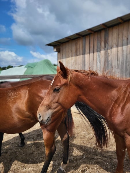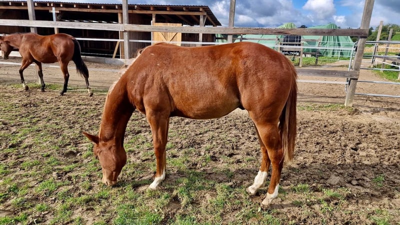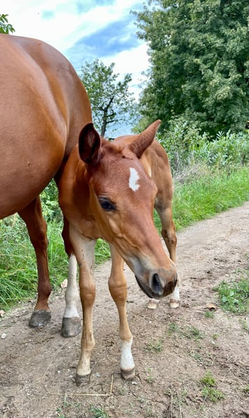 We are also looking for a 5 star home for our "Leo". The cool Quarter Horse stallion (born 2023) saw the light of day with us. His parents are also on our farm: Dam: TL Blue Alice (Aint It The Blues) Sire: Zippos King Bar Leo is a "cool sock" in every respect. He wants to please his owner at all times and is always calm and quiet. He has an athletic, correct conformation and is blessed with an outstanding gait. He is suitable for both competitions and leisure time. He is currently still a stallion and shows no stallion behavior. He is simply a treasure to handle. He has learned everything you need to know at this age: Giving hooves, introducing him to the farrier, grooming, showering/washing, walking/leading. Leo has all his basic vaccinations, is regularly wormed, has a DQHA equine passport and an AQHA certificate of registration. He is currently being bred with other young horses at our stables. He can either stay here for further rearing or move to his new home. If you would like to get to know Leo, just write to us.