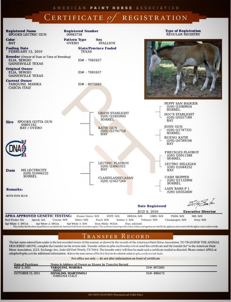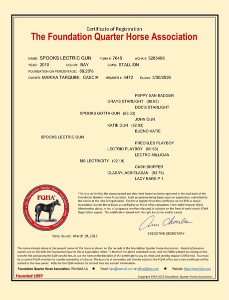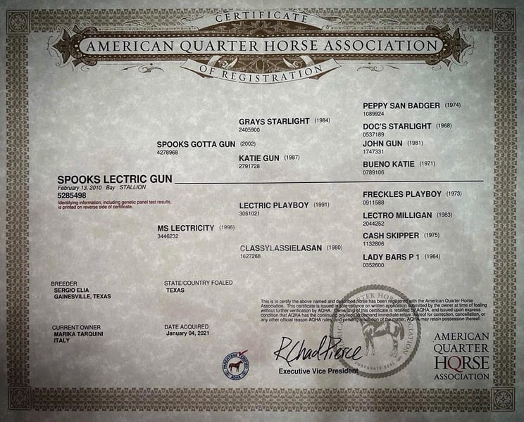 Spooks Lectric Gun is a 2010 AQHA/APHA/FAQH reining stallion by Spooks Gotta Gun (2M dollar sire) and out of MS Lectricity (PE$7000+), bred by Jan Elia (PuntaCl Ranch). He was shown in the Euro-reining industry since 2012 and. Here are some of his achievements • 2013 NRA European Derby Show - NRHA Non Pro Entry • 2013 NRHA-IRHA Futurity Non Pro Iv1&2 Finalist • 2014 APCR 4yo Futurity Non Pro Champion • 2014 APCR Non Pro Res. Champion • 2015 Salone del Cavallo Americano Derby all levels finalist • 2015 APCR Novice Horse Non Pro Champion Panel: LWO n/n, GBED n/n, HERDA /n, HYPP n/n, MH n/n, PSSM1 n/n, MYHM n/n Color variant: A/A, Ele, nd2/nd2, SW1/n, SW2/n, W20/n AVAILABE ONLY FRESH/REFRIGERATE SEMEN ALL EUROPE Option 1 – Launch Promo: €699 • Breeding fee: €800 •Collection, shipping & docs client pays • Live Foal Guaranteed •Limited slots: 5 – grab yours now! Option 2 – Full Package: €1,250 • 2 collections • 2 shipments (Italy/Europe) • Breeding report • Live Foal Guaranteed • Special gadget from Spooky • Standard: €1,400 – full package, no early discount • DM or WhatsApp to secure your slot • Early Booking ends soon – don’t miss out!