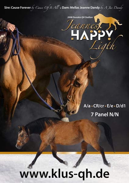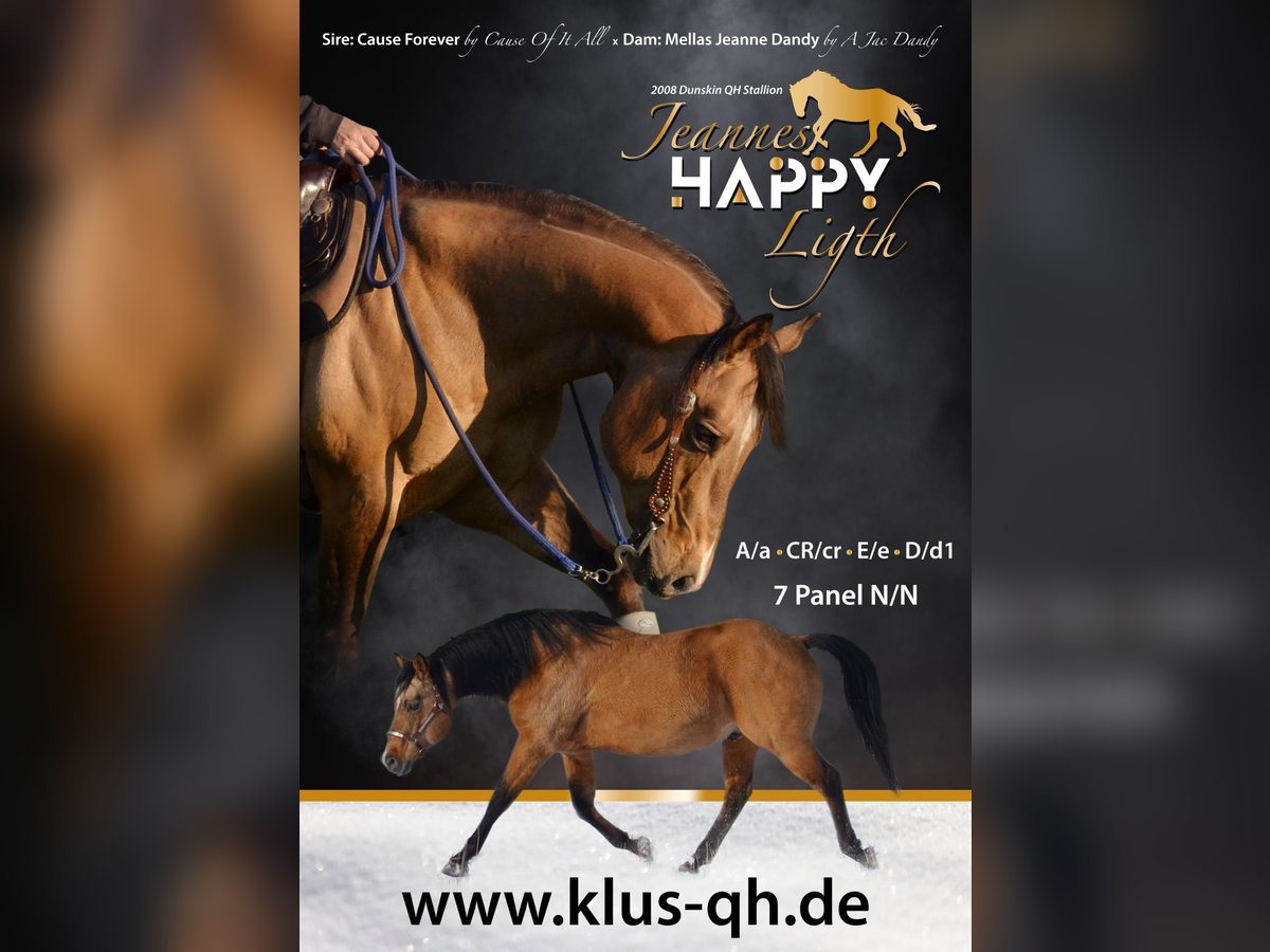 Happy se muestra como un semental muy equilibrado. Tiene un cuerpo fuerte y hermoso, con cascos grandes. Como se espera de un Quarter. Además, posee nervios de acero y tranquilidad. Happy puede ser visitado sin problema. En 2023, este buen semental procedente del sur de Alemania se unió a nosotros. Un semental de líneas antiguas y prestigiosas. Happy insemina de forma natural con calma. Sus crías destacan por su buena estructura y, en general, por sus colores especiales. Actualmente, tiene un color smoky grullo, dunskin, smoky cream, y aún estamos esperando algunos potros. Tarifa de monta 2025: 500 € para Quarter/Paint = 580 € + 80 € de tarifa de reserva 300 € para otras razas y ZSSE = 380 € + 80 € de tarifa de reserva