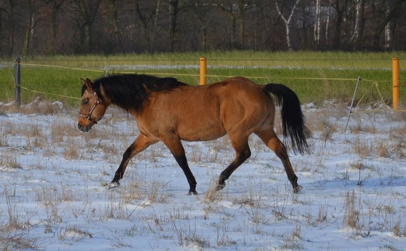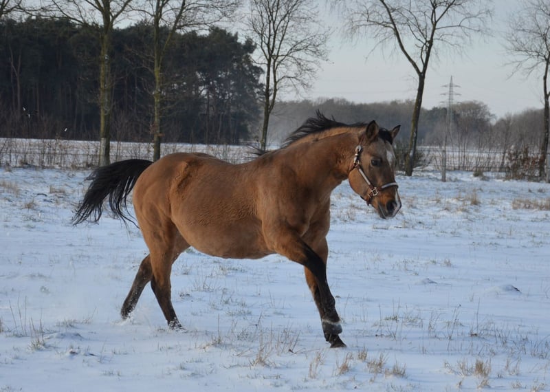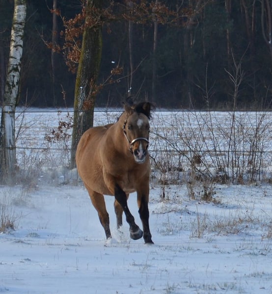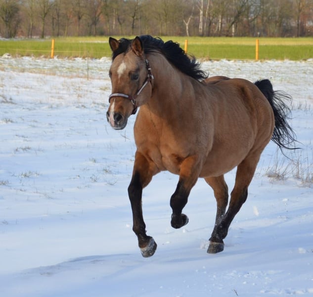 Happy se révèle être un étalon très équilibré. Il a un beau body puissant avec de gros sabots. Comme on peut rêver d'un quarter. En plus, il a les nerfs solides et est très cool. Happy peut être visité avec plaisir. En 2023, il a quitté le sud de l'Allemagne pour venir chez nous. Un candidat étalon des anciennes lignées. Il a encore sailli quelques juments chez nous en 2023 et là aussi, il s'est montré très sociable lors de la saillie à la main en monte naturelle. Nous attendons donc sa première descendance à la ferme dès 2024. Il saillira chez nous à partir de mars 2024 en monte naturelle.