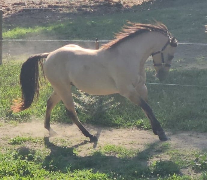 Nom : Spooks Whiz Crome 86 Numéro AQHA : Reg 6325811 Tests génétiques : 6 Panels Clear N/N : GBED, HYPP, MYHM, HERDA , MH, PSSM1 Race : Quarter Horse AQHA / NFQHA 91% Foundation Couleur : Buckskin Dun - E/e, A/a, n/Cr, D/nd2 Dunskin