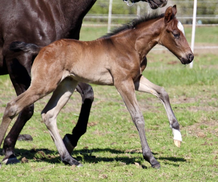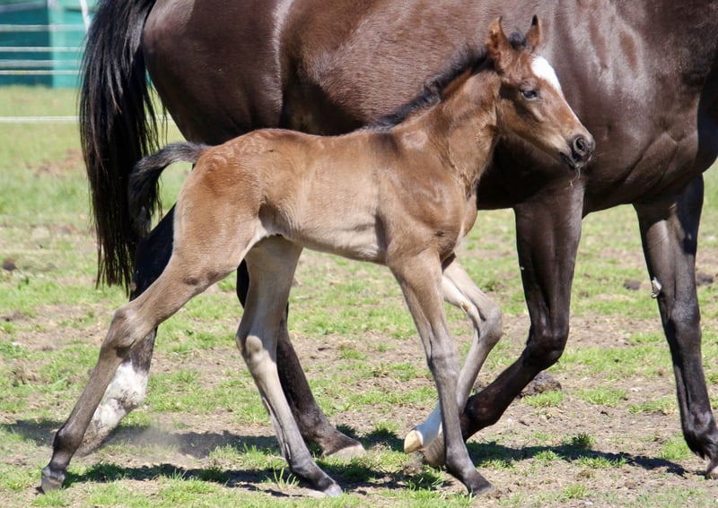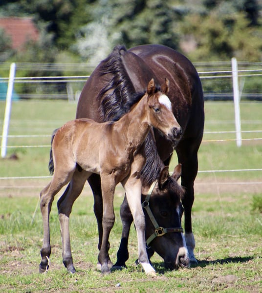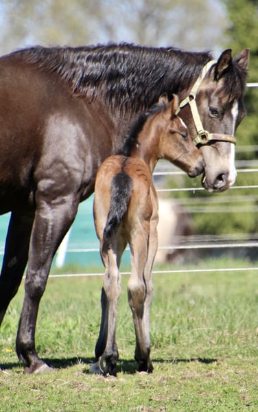 Sire: MJM Saltys Blue Ezra Dam: PR Diabolos Diamond Am 10.04.2026 ist dieses wunderschöne Hengstfohlen in bay roan geboren! „Salty“ überzeugt durch sein hervorragendes Gebäude…er hat ein starkes Fundament und eine schön definierte Muskulatur! Charakterlich ist er sehr aufgeschlossen und im Moment klebt er noch gut an Mamas Seite Er hat bereits die Koppeltage in der Sonne gießen dürfen und wächst im Herdenverband mit weiteren Fohlen auf! Durch sein Pedigree ist er ein echter Juwel für Foundation Fans…sein eigentlicher Anteil wird derzeit berechnet. Bei Interesse erzähle ich gern persönlich mehr über den jungen Mann! Ratenzahlung möglich Die letzten Bilder zeigen den Papa
