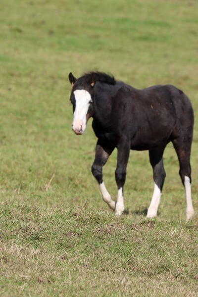CHEYENNESJUJUGUNPLAY Dunkel Brauner Splash Overo AQHA Hengst. (homozygot black) Geboren: 18.05.2025 Endgrösse ca 150 cm 7 Panel N/N EE Aa SW2/n
