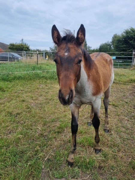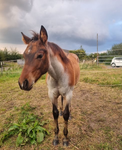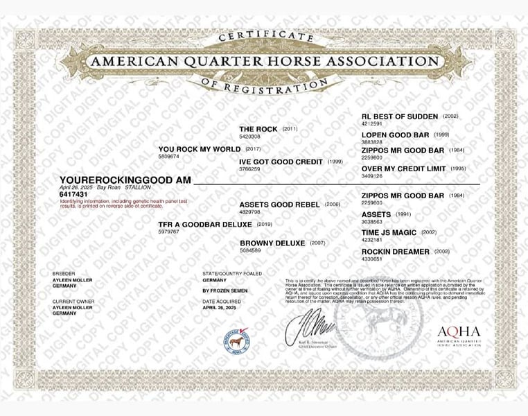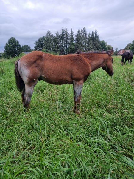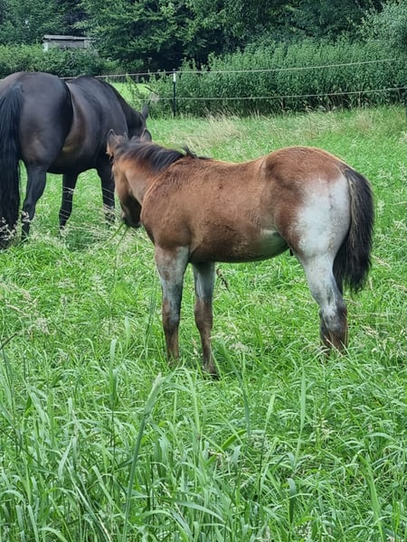AQHA Colt – Bay Roan – "Peanut" Pleasure & Allround Prospect with Top Pedigree On April 26, 2025, our Hazel gave birth to a very special colt: Peanut – a beautiful, correctly built Bay Roan with great presence, clear movements, and a friendly yet brave temperament. Even in his first days, Peanut is showing his expressive gaits, a lot of balance, and remarkably good transitions. He has the talent to develop into a promising Pleasure and Allround horse for higher-level competition. He will surely also be interesting for Western Riding – he transitions very flat and cleanly. Peanut is already loading well into the trailer, walks along the main road, is familiar with all kinds of motorized equipment, and bathing is also no problem. He has also mastered his first farrier appointment with flying colors. He is super unflappable, brave, and very people-oriented. Pedigree: Peanut is sired by You Rock My World (1.60 m) × TFR A Goodbar Deluxe (1.54 m). A look at his pedigree speaks for itself: The Rock, RL Best Of Sudden, Ive Got Good Credit, Dynamic Deluxe, and Assets Good Rebel – all wishes are fulfilled here. Raising & Care: Peanut is being raised in a species-appropriate manner on spacious pastures in summer and dry areas in winter. Mother and foal are regularly dewormed and provided with high-quality minerals and vitamins. The well-being of our animals is our top priority, and nothing is spared! Further Information: Born: April 26, 2025 Color: Bay Roan Insured (Life & Surgery) Available from around November (after careful weaning), but he can stay longer by arrangement. Hazel, Peanut's mother, is 6 years old, healthy, people-oriented, and absolutely reliable – so much so that my little niece was already able to ride her safely at the age of 4. At the North Futurity 2021, she already achieved success as a two-year-old: Reserve Futurity Champion 2yo Halter Reserve Futurity Champion Longe Line NSBA 2yo Longe Line AQHA 2yo Trail in Hand 5th Placings in Junior Pleasure, but due to my lack of time, she was not presented further. Peanut is an ideal young horse for sport and leisure with charm, quality, and the best foundation. If you are seriously interested, we look forward to a personal message or a call! It is definitely about space before price – we can surely come to an agreement here.