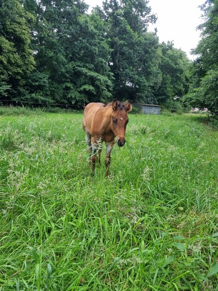 AQHA Hengstfohlen – Bay Roan – "Peanut" Pleasure & Allround Prospect mit Top-Pedigree Am 26.04.2025 hat unsere Hazel ein ganz besonderes Hengstfohlen zur Welt gebracht: Peanut – ein wunderschöner, korrekt gebauter Bay Roan mit toller Präsenz, klaren Bewegungen und einem ebenso freundlichen wie mutigen Wesen. Schon an den ersten Tagen zeigt Peanut seine ausdrucksstarken Gänge, viel Balance und auffällig gute Manöverwechsel. Er bringt das Talent mit, sich zu einem vielversprechenden Pleasure- und Allroundpferd für den gehobenen Sport zu entwickeln. Er wird sicher auch interessant für die Western Riding werden - wechselt sehr flach und sauber durch. Peanut fährt bereits brav Anhänger, läuft an der Hauptstraße, kennt jegliche Art von motorisierten Geräten und Abduschen ist ebenfalls kein Problem. Den ersten Hufschmiedtermin hat er auch mit Bravour gemeistert. Er ist super unerschrocken, mutig und dem Menschen absolut zugewandt. Abstammung: Peanut stammt ab von You Rock My World (1,60 m) × TFR A Goodbar Deluxe (1,54 m). Ein Blick in sein Pedigree spricht für sich: The Rock, RL Best Of Sudden, Ive Got Good Credit, Dynamic Deluxe und Assets Good Rebel – hier bleiben keine Wünsche offen. Aufzucht & Haltung: Peanut wächst bei uns artgerecht auf weitläufigen Weiden im Sommer sowie trockenen Flächen im Winter auf. Mutter und Fohlen werden regelmäßig entwurmt und mit hochwertigen Mineralstoffen sowie Vitaminen versorgt. Das Wohl unserer Tiere steht für uns an oberster Stelle und es wird an nichts gespart! Weitere Infos: Geboren: 26.04.2025 Farbe: Bay Roan Versichert (Leben & OP) Abgabe ab ca. November (nach behutsamem Absetzen), nach Vereinbarung kann er auch länger bleiben. Hazel, Peanuts Mutter, ist 6 Jahre alt und kerngesund, menschenbezogen und absolut zuverlässig – so sehr, dass bereits mit 4 Jahren meine kleine Nichte sicher auf ihr reiten konnte. Auf der Nordfuturity 2021 konnte sie zweijährig bereits Erfolge Sammeln: Vize Futurity Champion 2yo Halter Vize Futurity Champion Longe Line NSBA 2yo Longe Line AQHA 2yo Trail in Hand 5th Platzierungen Juniorpleasure, aber aufgrund von Zeitmangel meinerseits ist sie nicht weiter vorgestellt worden. Peanut ist ein ideales Nachwuchspferd für Sport und Freizeit mit Charme, Qualität und bester Grundlage. Bei ernsthaftem Interesse freuen wir uns über eine persönliche Nachricht oder einen Anruf! Es gilt definitiv Platz vor Preis - hier würde man sich sicher einig werden.