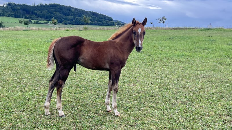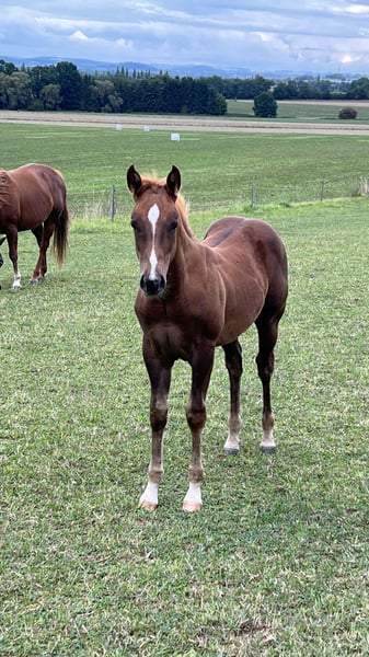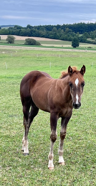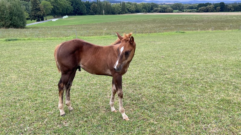 We are looking for the best home for our little one. He is very affectionate and loves to cuddle with people. He is already halter trained, picks up his hooves well, and goes out on trails as a companion horse. He is accustomed to standing tied, allows grooming and handling everywhere. He is familiar with dogs, cats, tractors, road traffic, and crossing rivers. He is regularly presented to the farrier, and the veterinarian is also no problem. His body is correctly built, muscular, he moves very well, and shows a natural talent for reining maneuvers. The little one is a grandson of Wimpys Little Step. His mother is from Time For Heida/Acres Of Time. He is growing up in a paddock with large pastures in a small herd. He is 5 Panel negative. He will be microchipped, receives full USA papers, and an equine passport. He can move to his new home in November. His father is Great Little Step - last picture.