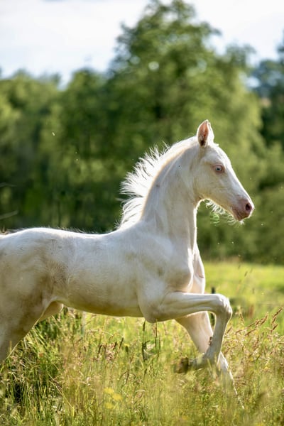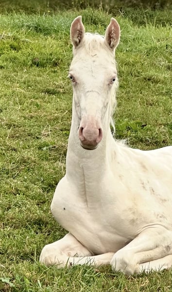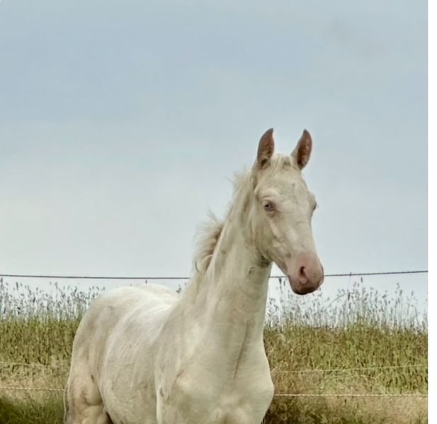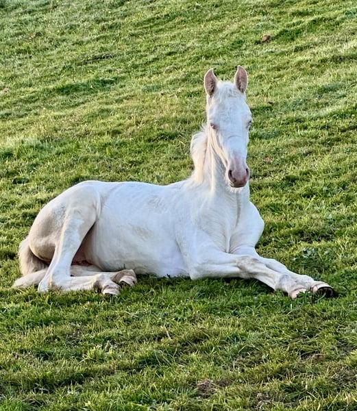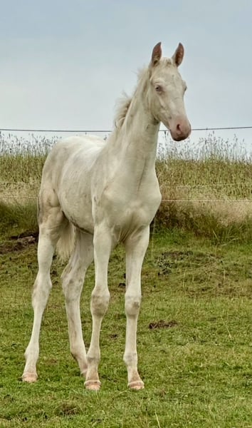 ✨ Introducing "Dance of the Sugar Fairy," a filly that stands out among her peers – a true masterpiece of nature. She is the only Cremello Tobiano foal worldwide within the American Saddlebred breed – a living rarity that captivates instantly with her grace and presence. Her appearance resembles a dance of light and movement: noble, harmonious, full of expression, and with a commanding presence that cannot be overlooked. Even now, she displays the proud carriage and floating lightness that make the American Saddlebred so unmistakable, making her truly special in her own right. ⸻ 💎 Special Features - Unique Color Genetics: the only Cremello Tobiano Saddlebred foal worldwide - Impressive Presence: elegant build, noble head, clear eye - Excellent Pedigree: combining quality, type, and character - Future Potential: ideal for show, breeding, and demanding riding disciplines ⸻ 🌷 Origin & Rearing "Dance of the Sugar Fairy" is raised with great care – with daily attention, top-quality nutrition, and expert guidance. She is already familiar with the basics of foal training, is human-oriented, curious, and consistently displays a natural calmness. ⸻ 🌟 A Promise for the Future This foal is not just a horse – it is a rarity, a statement, and an investment in the extraordinary. "Dance of the Sugar Fairy" embodies what true horse enthusiasts seek: beauty, rarity, and soul. ⸻ 📍 Location: WingWalkerFarm, 58566 Kierspe / NRW 📞 Contact: 0151 21582655 | info@wingwalkerfarm.de