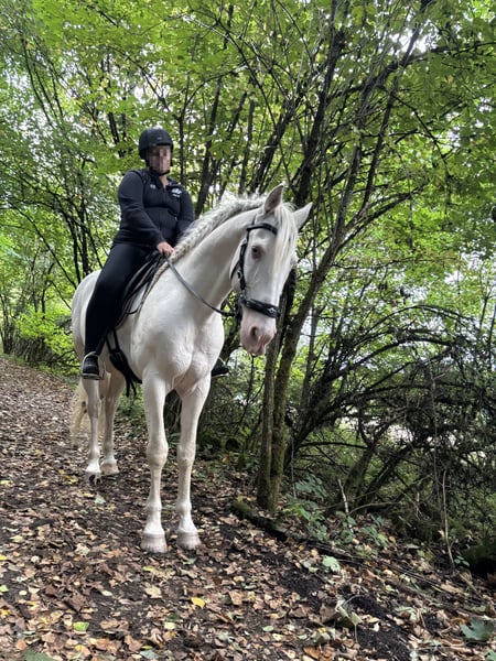 A true Spanish gentleman through and through, but also a bit of a joker and a prankster at times! Our stunning Hermano, in the special Cremello coat, is the perfect horse in every way. Beautiful, reliable, straightforward, and comfortable to ride with the finest aids, ridden bitless. Hermano masters the basic gaits, shoulder-in, leg-yield, traverses, rein-back, as well as a bit of piaffe and the Spanish walk. Naturally, he also understands the compliment, lies down on command, and can sit and laugh. In the herd, he tends to stay on the periphery. An excellent horse for leisure riding, dressage, and shows.