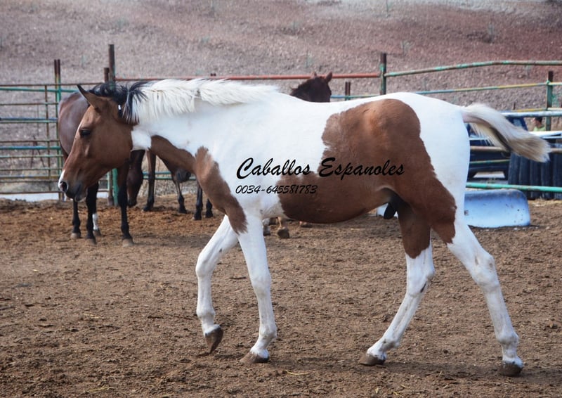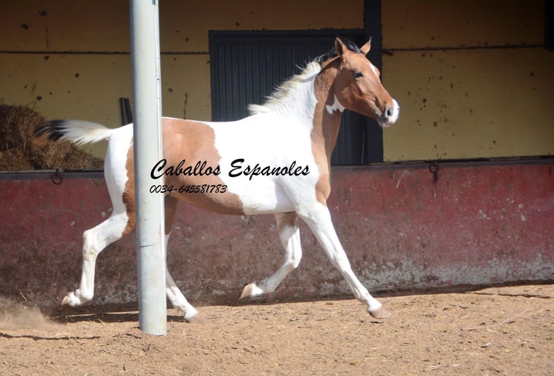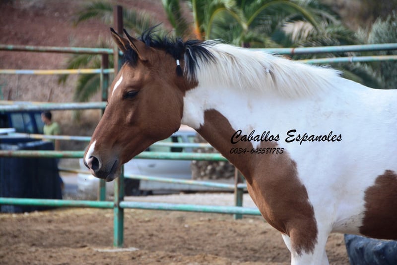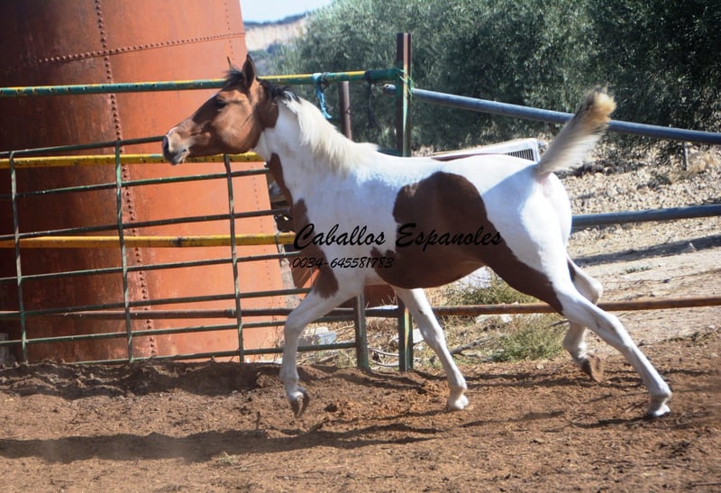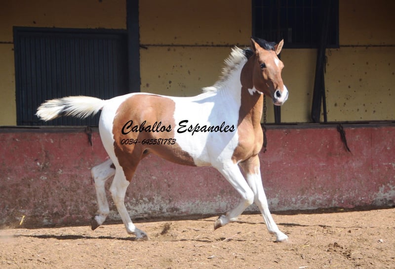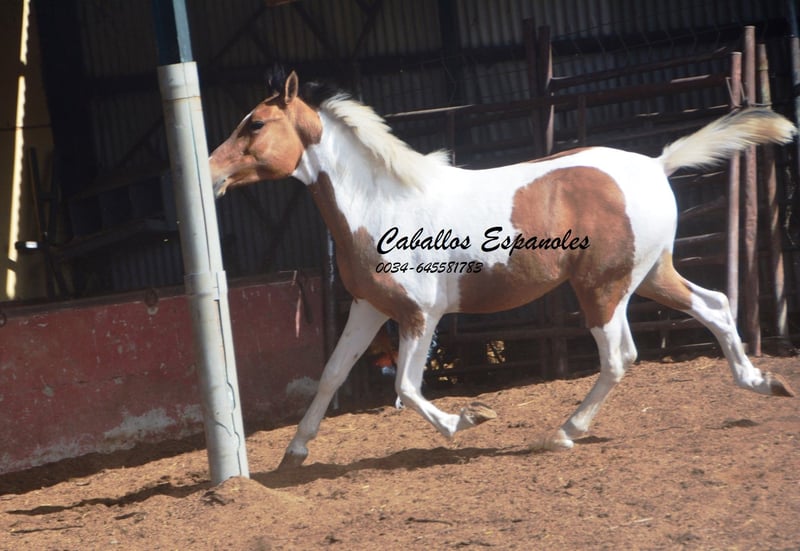 Ce charmant étalon espagnol pie bai andalou possède une conformation solide et une très belle robe pie. Le jeune cheval se trouve avec ses compagnons dans le paddock et aime jouer avec eux. Au début, il peut être un peu timide, mais il se détend rapidement et a apprécié qu’on lui caresse la crinière. C’est un jeune étalon idéal pour une reproduction autonome. Si vous êtes intéressé, nous serions ravis de recevoir votre contact pour discuter des détails ou organiser une visite. Le cheval est vendu pour le compte du propriétaire. Il peut rester en pension chez nous pour son dressage. Une échographie peut être organisée rapidement. Transport international disponible.