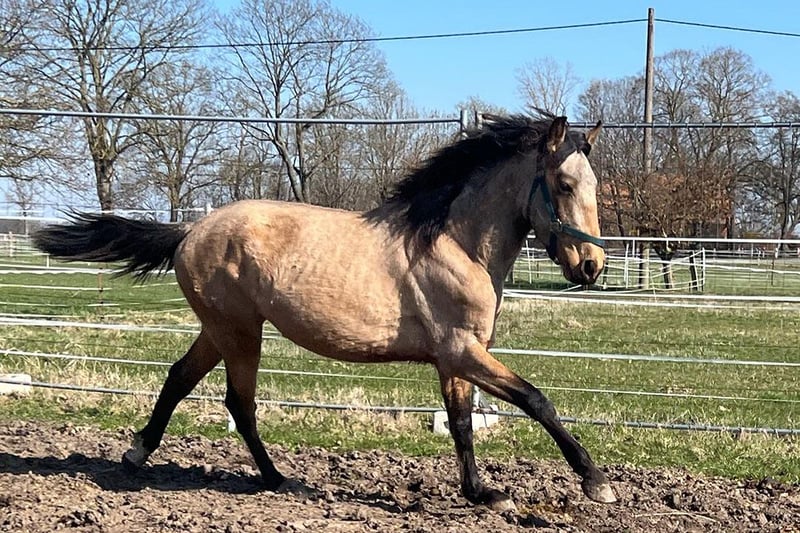 Gold Boy with a Taste for Adventure Seeks a Partner This 3-year-old Andalusian-Lusitano gelding in the charming rare color of buckskin knows exactly: looking good is one thing – having character is another. And he can do both. Raised in a small, high-quality breeding program, he has neither box stall neurosis nor bad manners. Instead: 24/7 herd life, plenty of movement on spacious, hilly terrain, providing the perfect foundation for strong nerves, stable legs, and a clear mind. His bloodlines reliably deliver what one wishes for (and what is unfortunately not always a given): 🧠 Thinks along 🦁 Brave but not reckless ❤️ Eager to work 🤝 Maintains friendliness 💪 Endures longer sessions This young gentleman is now ready to start his career and is looking for someone to show him how exciting life as a riding horse can be. Possible disciplines? Almost anything that’s fun: Western, English, dressage, working equitation, trail riding, endurance riding – he’s open to new opportunities and learns quickly. Summary: A golden-colored rough diamond that hasn’t been “taught” to break, works instead of arguing, and will surely become the type of horse you say: “I’d never want to part with him.” ✨🐎