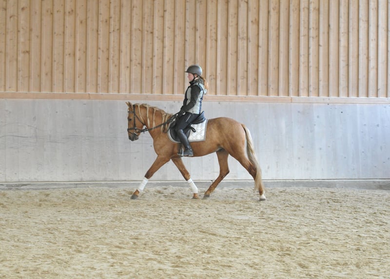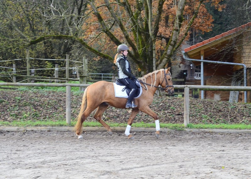 Auffälliger Palomino-Wallach in begehrter Farbe, mit viel Ausdruck und 3 guten GGA ausgestattet. Caramelito bewegt sich sehr leichtfüßig, ist dabei sehr rittig und angenehm zu sitzen. Er kennt auch Gelände und Halle, er meistert seine täglichen Anforderungen unter dem Sattel hervorragend und überzeugt durch top Einstellung.