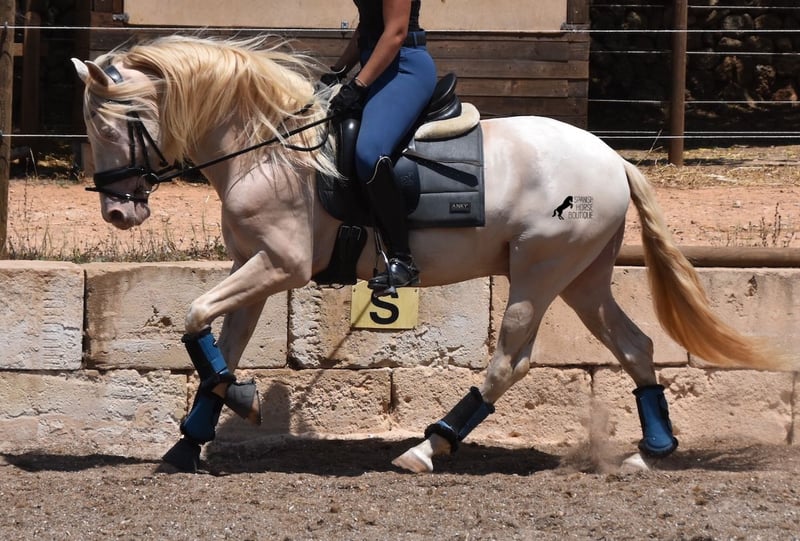 This Andalusian gelding, born in 02/2020, is an absolute sweetheart! Since weaning, he has grown up with his owner under the best care and enjoys a wonderful life in his large paddock in 24h robust husbandry with a horse buddy and many dogs that keep him company. The owner is very keen on dressage and he has the talent and movement for it. Unfortunately, at 149cm, he is a little short to compete properly. We are therefore now looking for a good home for this darling. He already has competition experience with placings and behaves really well for a youngster, even outside his usual environment. At home he is absolutely cool and wants to do everything right. Under saddle, he has a correct, age-appropriate basis on a water snaffle and is not only suitable for dressage, but also for working equitation or western riding, as he is short and very agile. His strong back is particularly great for a young horse, which reflects the correct training. He also has beautifully clear legs and what is really great is that despite his light skin and Mallorca's very strong sun, he has no skin/coat problems! An absolute gentleman and a horse of the heart, with a big heart, in a small format. Price according to quality. He is currently in Mallorca! Videos on request. I would be happy to organize an AKU, riding, transport or even your trip, should you come to see him in person. Details can be found on my website or in conversation. Saludos from Spain